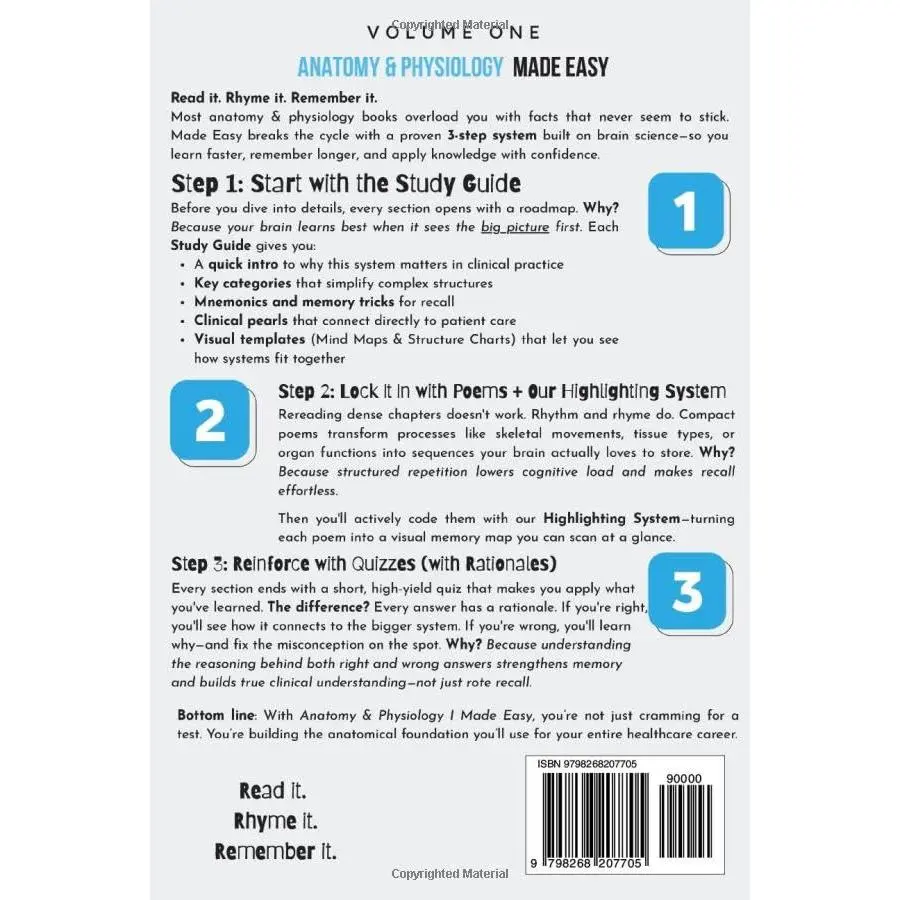 Anatomy & Physiology I Made Easy uses a proven 3-step system built on brain science that helps you learn faster, remember longer, and feel confident in labs, exams, and patient care.