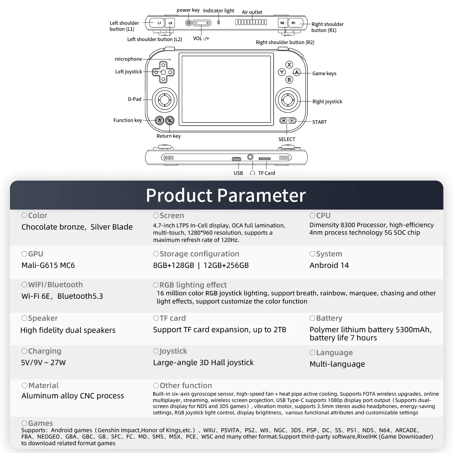 Other function:Built-in six-axis gyroscope sensor,high-speed fan+heat pipe active cooling.Supports FOTA wireless upgrades,online