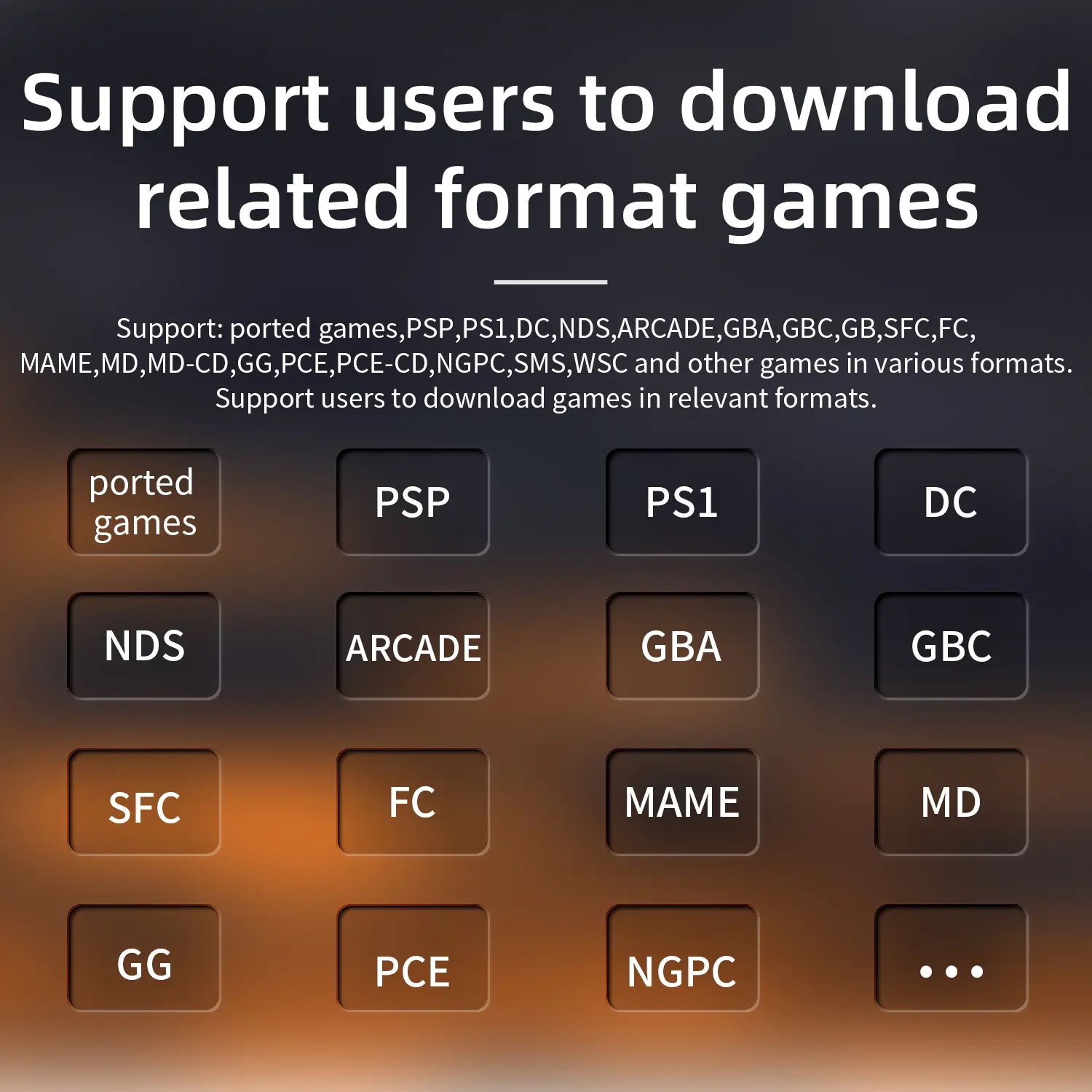 Games:Support: ported games,PSP,PS1,DC,NDS,ARCADE,GBA,GBC,GB,SFC,FC,MAME,MD,MD-CD,GG,PCE,PCE-CD,NGPC,SMS,WSC and other games in various formats.Support users to download games in relevant formats.