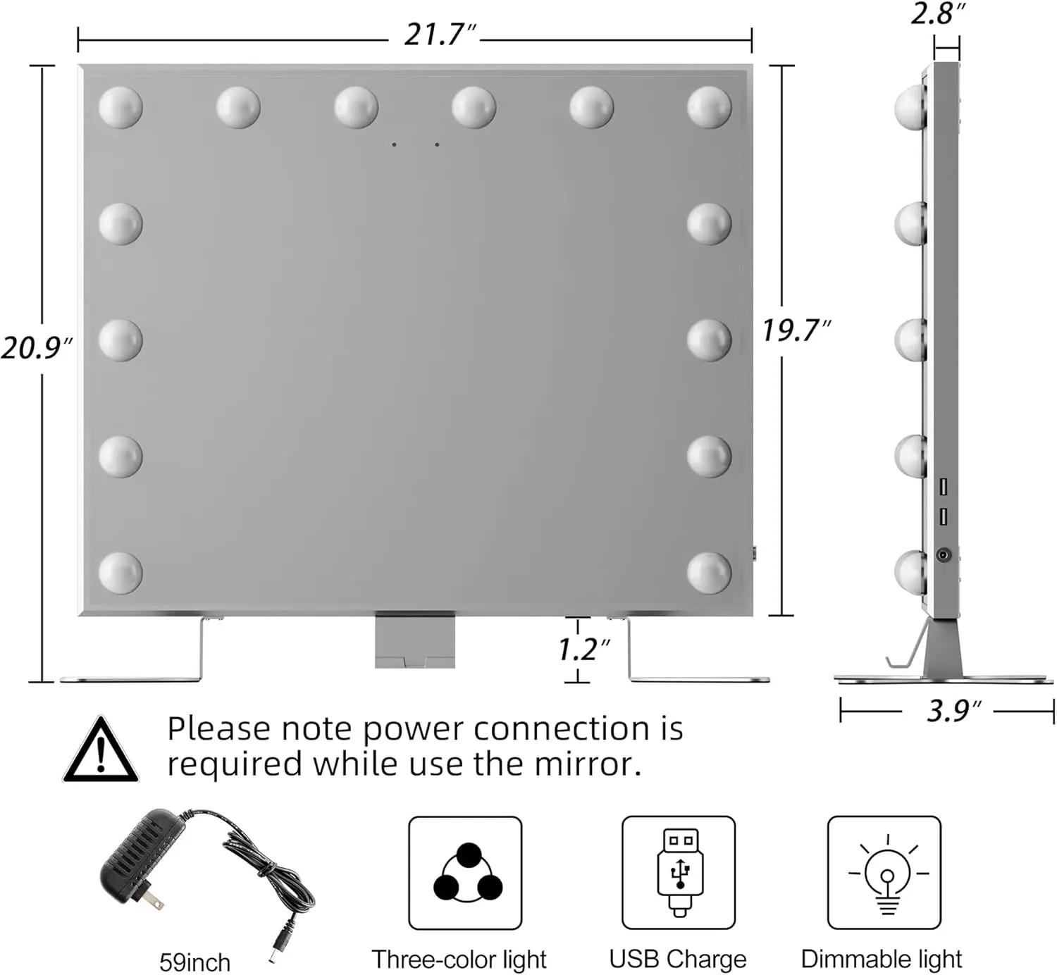 ·14 LED Bulbs - This vanity mirror with 14 LED dimmable bulbs, size is 21.7''(L) x 19.7''(H), perfecrt for dresser, bedrooms, hallways, salons, backstage. Two USB outlets at side is convenient to charge your phone and other smart products. Please note Power connection is required while use the mirror.