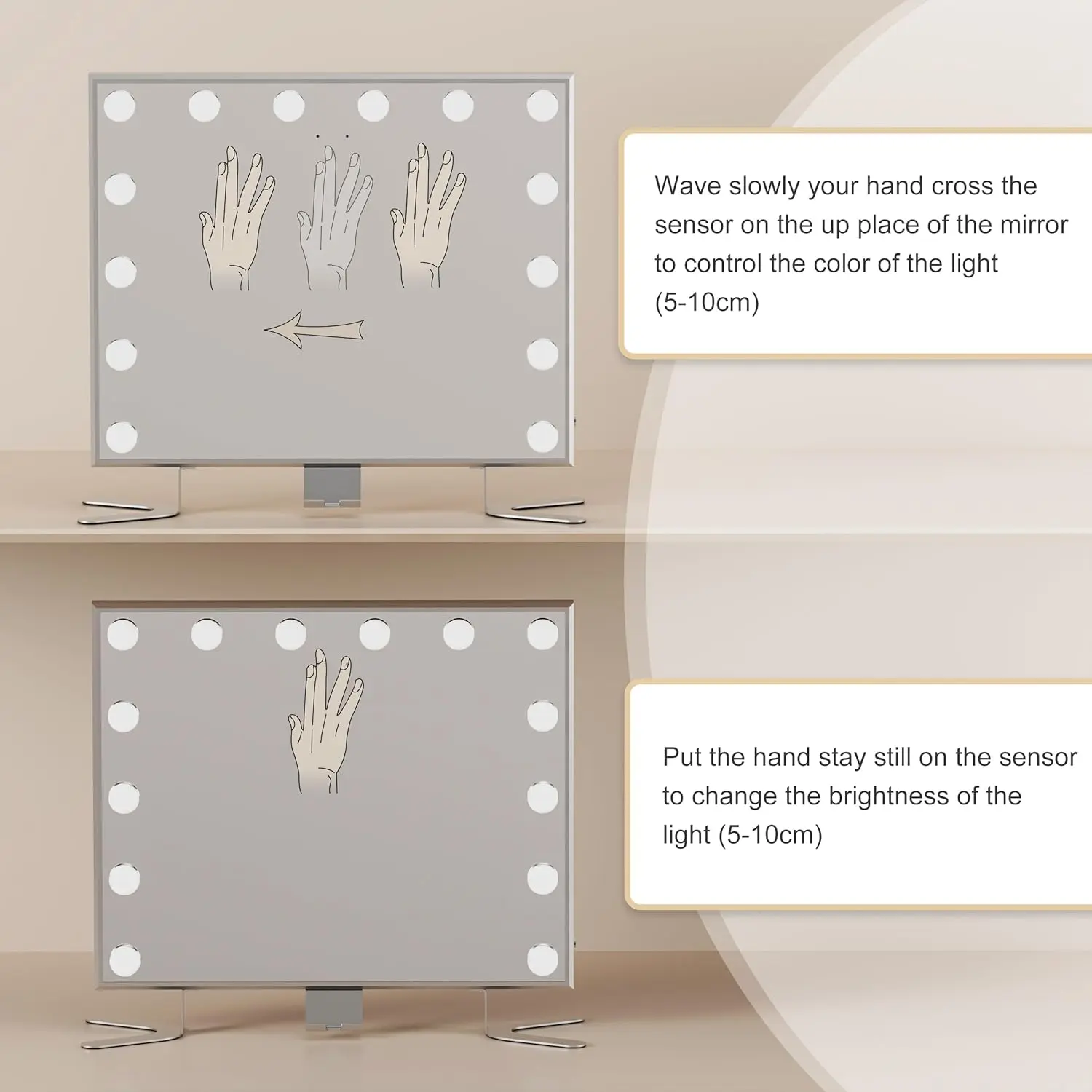 ·Intelligent Induction Control- Adopting a new mode of intelligent sensing, the light can be adjusted by waving. Wave slowly your hand cross the sensor selects sutiable color light for the makeup. Put the hand stay still on the sensor to change the brightness of the light.
