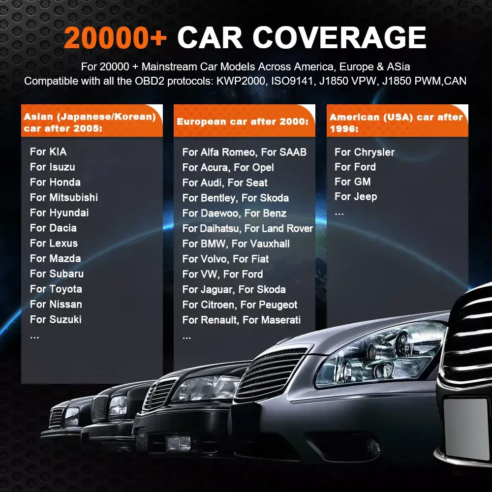 ·Japanese Car: Compatible with Standard OBD2 Cars from 2005 to Now:for KIA, for Isuzu, for Honda , for Mitsubishi, for Hyundai, for Dacia, for Lexus, for Mazda, for Nissan, for Subaru, for Suzuki, for Toyota
