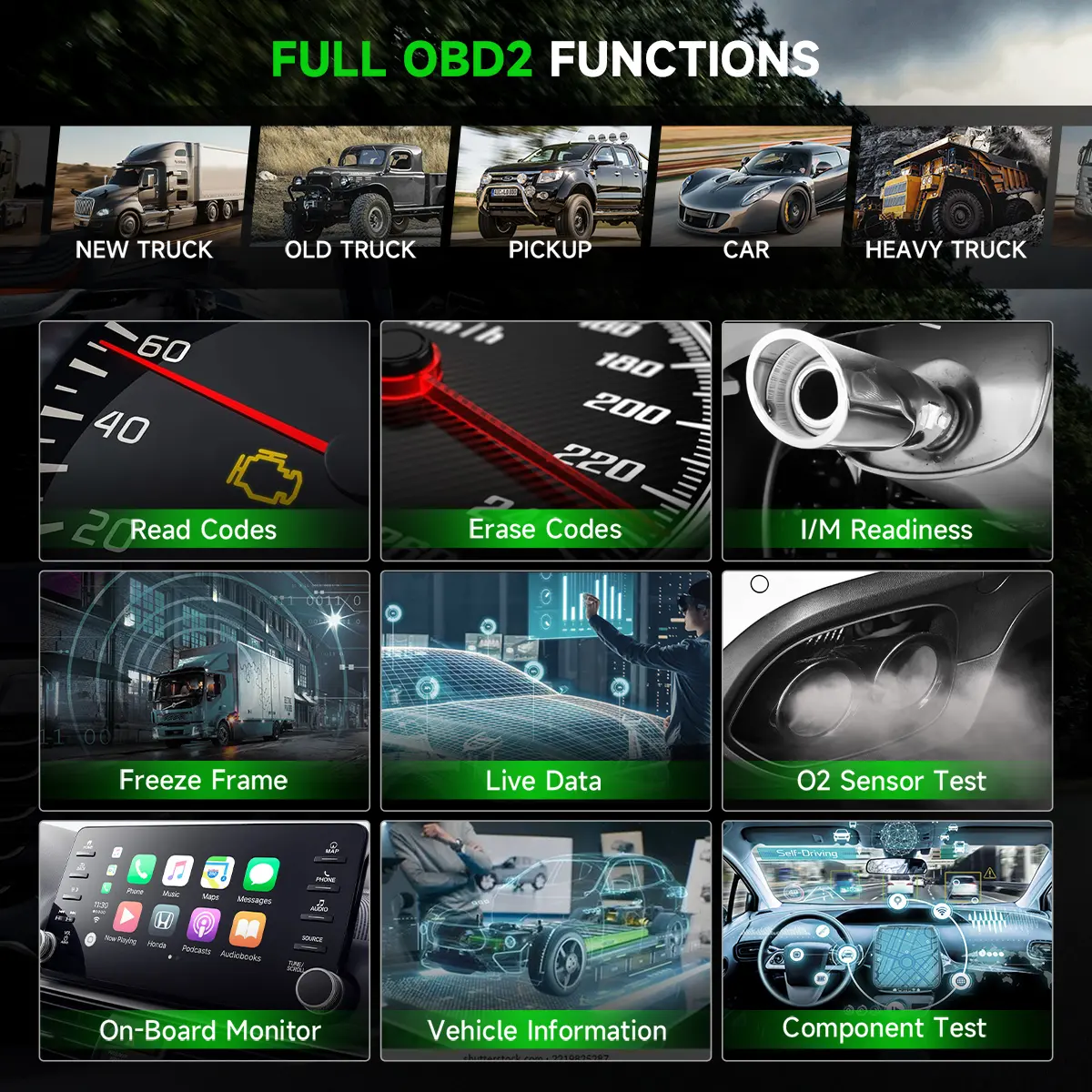 Use it as a semi-truck diagnostic tool and a standard OBD2 scanner. It allows viewing live data, accessing ECU and vehicle information, and supports advanced functions like freeze frame and I/M readiness.