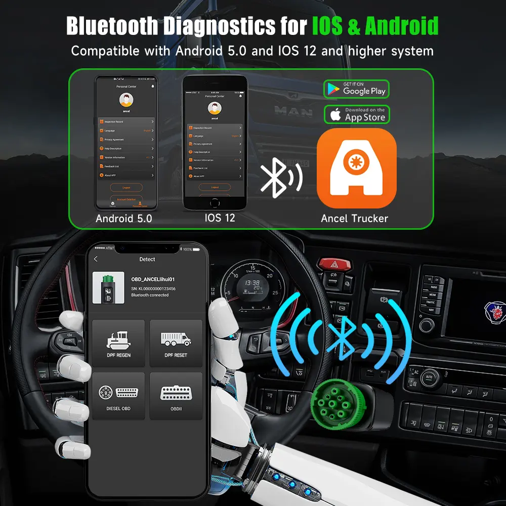 Standard 9-pin locking connector and 16-pin OBD2 plug. The locking mechanism prevents disconnections during regen or scanning. Enjoy lifetime free updates with the ANCEL Trucker App.