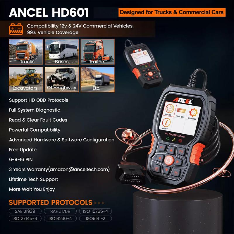 After the upgrade, the compatibility is wider and more accurate! HD601 heavy duty truck scanner supports all major truck models that comply with standard protocols (SAE J1939, SAE J1708, ISO 14230-4, ISO 15764-4 and ISO 9141-2, ISO 27145-4 and Euro6). Fits for Cummins, Paccar, Detroit, Perkins, Freightliner, International, Peterbilt, Ford, Class 4-Class 8 trucks, etc. It also check engine diagnosis on most cars, minivans and light trucks