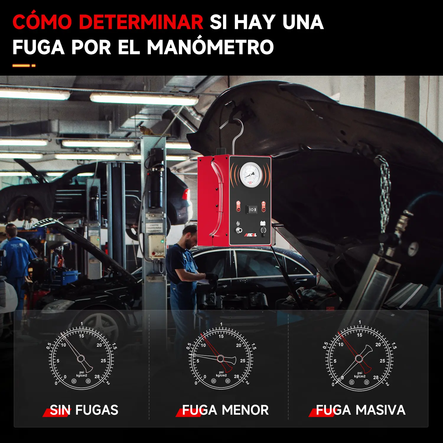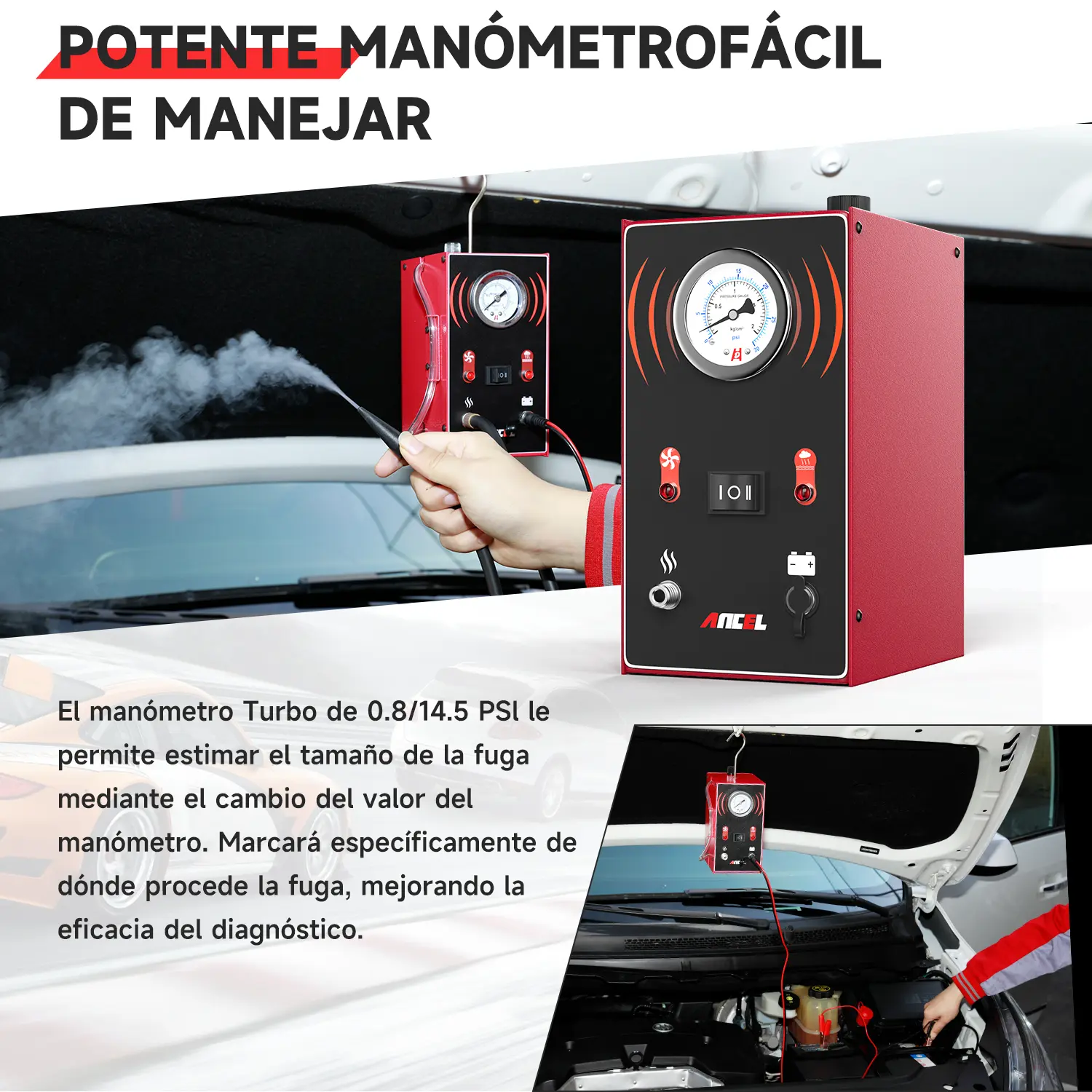 【Build in Pressure gauge 】 to monitor total sytem pressure . Smoke mode to introduce smoke into vehicle system for leak detection.