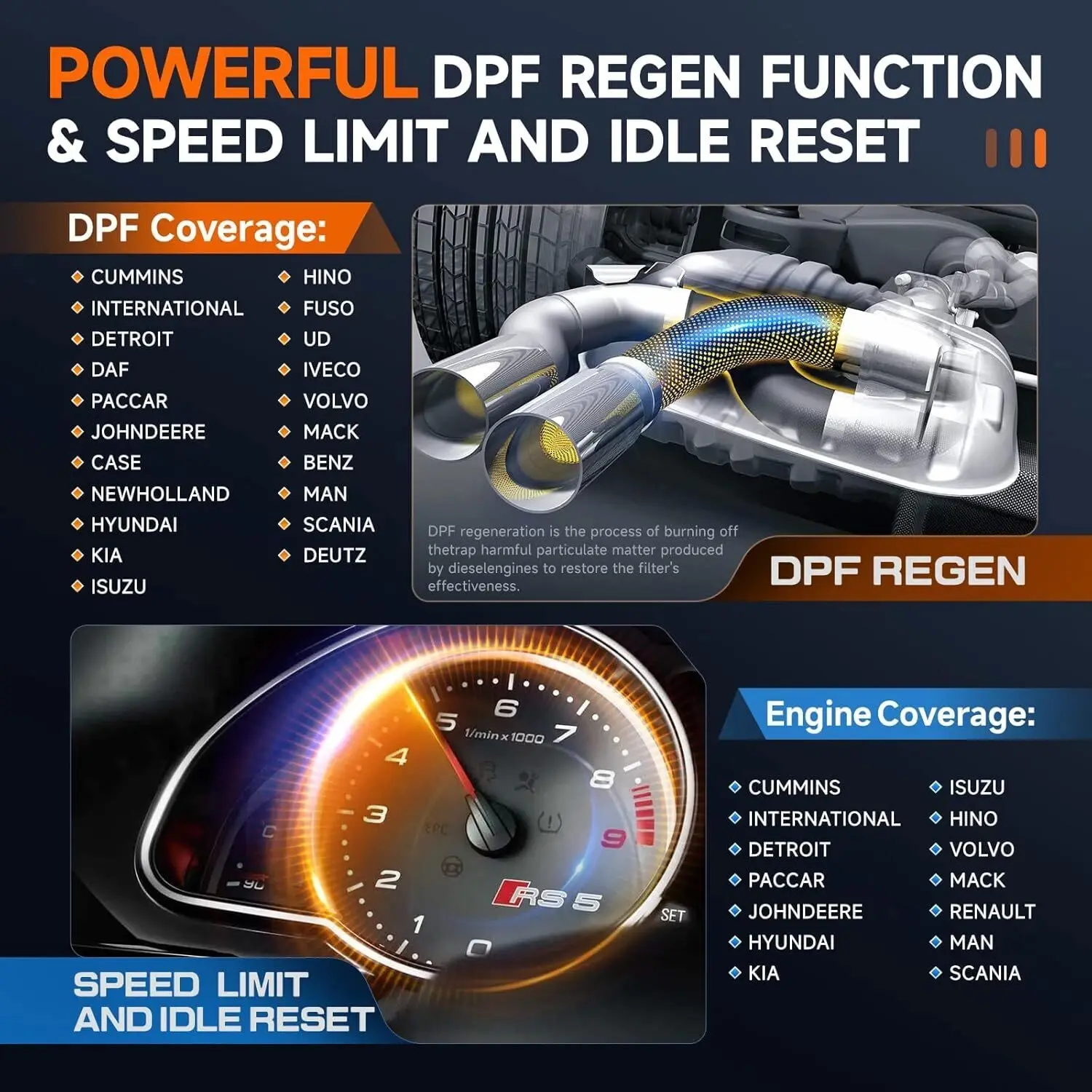 Newest top heavy duty truck scan tool, comes with 42+ special services (ECU, Speed Limit and Idle Reset, Oil Reset, Injector Coding, EPB, ABS, SRS, Suspension, Throttle, etc. and always keep growing), which meet all your various needs for service and maintenance. Please send your VIN# to our to check compatibility.