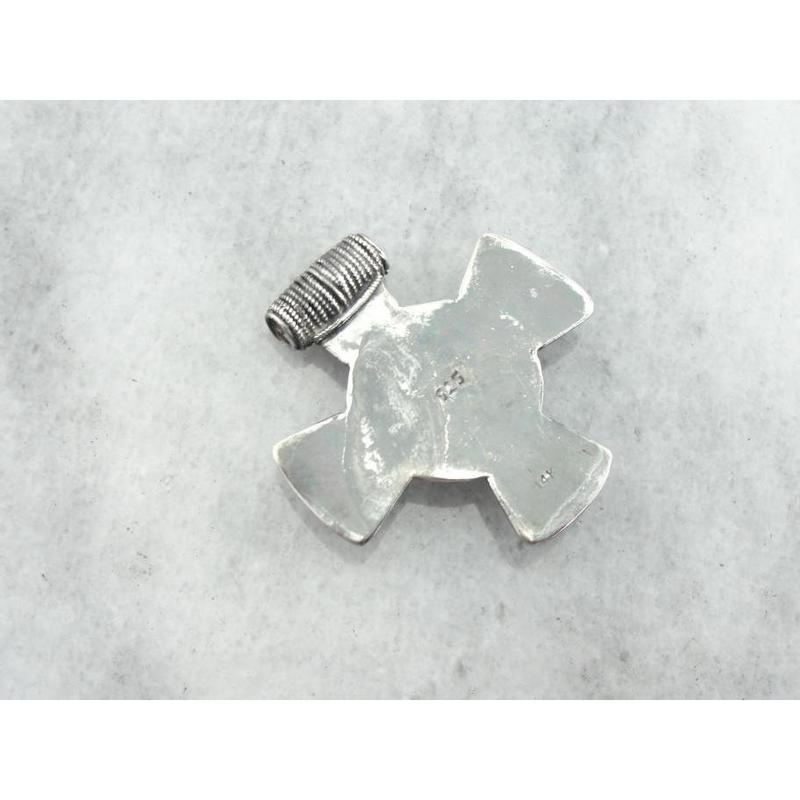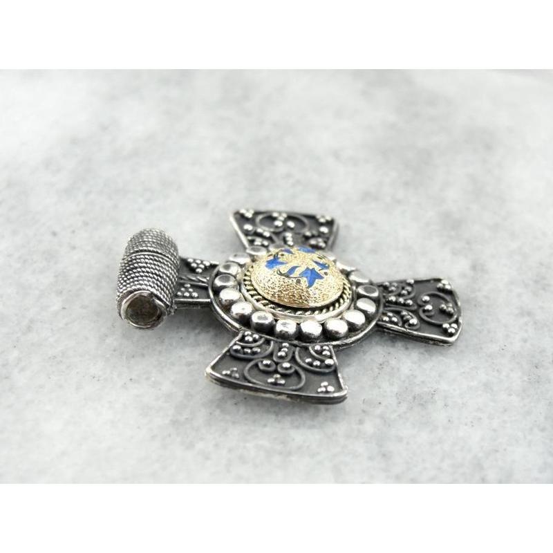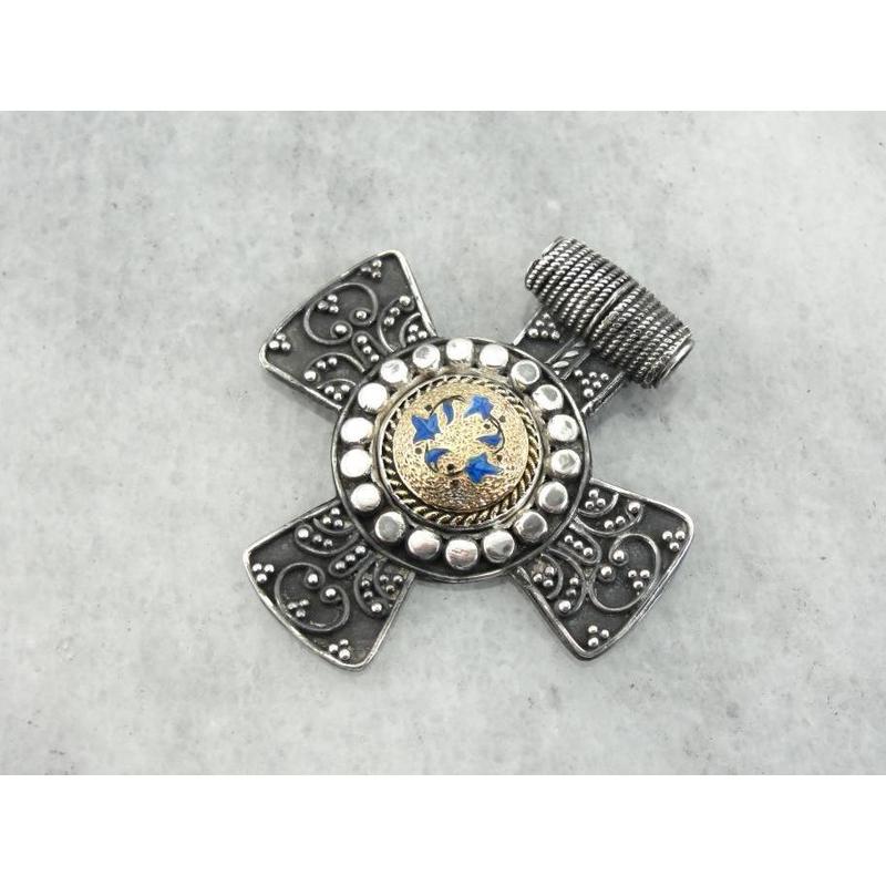 Arabesque lines and intricate beadwork give this equal armed cross an ancient feel. We've updated the center with a beautiful gold piece from the Victorian Era with deep blue enamel creating a precise botanical image at the center.