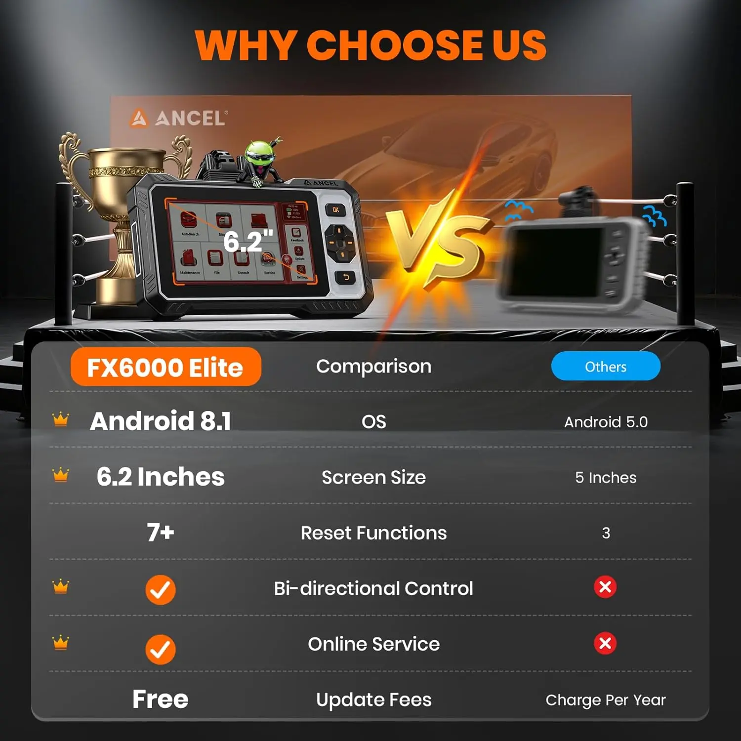 ·Powered by Android 8.1 and a fast quad-core processor, the FX6000 Elite runs faster and more stably. The 6.2-inch HD touchscreen plus physical buttons offer smooth control. With 32GB ROM and 2GB RAM, it easily stores 50,000+ diagnostic reports.