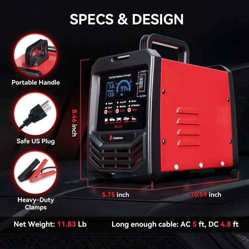 [Heavy-Duty Battery Charger] This car battery charger is constructed with a copper coil, metal, and ABS casing, featuring a silent cooling fan and an easy-carry handle. Weighing 9.81 lbs, it is designed to charge, maintain, and repair all 12V and 24V lead-acid automotive batteries, marine batteries, and deep-cycle batteries (including AGM, GEL, Wet/Flooded, EFB, Calcium, MF batteries, etc.). It is suitable for cars, trucks, motorcycles, boats, RVs, lawn mowers, SUVs, and more.