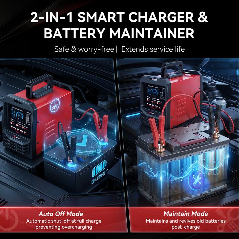 [Auto Off / Maintain Mode] The Auto Shut-off Mode stops charging once the battery is fully charged, preventing overcharging. The Maintain Mode uses a pulse current to restore and extend the lifespan of old, drained, stratified, and sulfated batteries after they are fully charged.