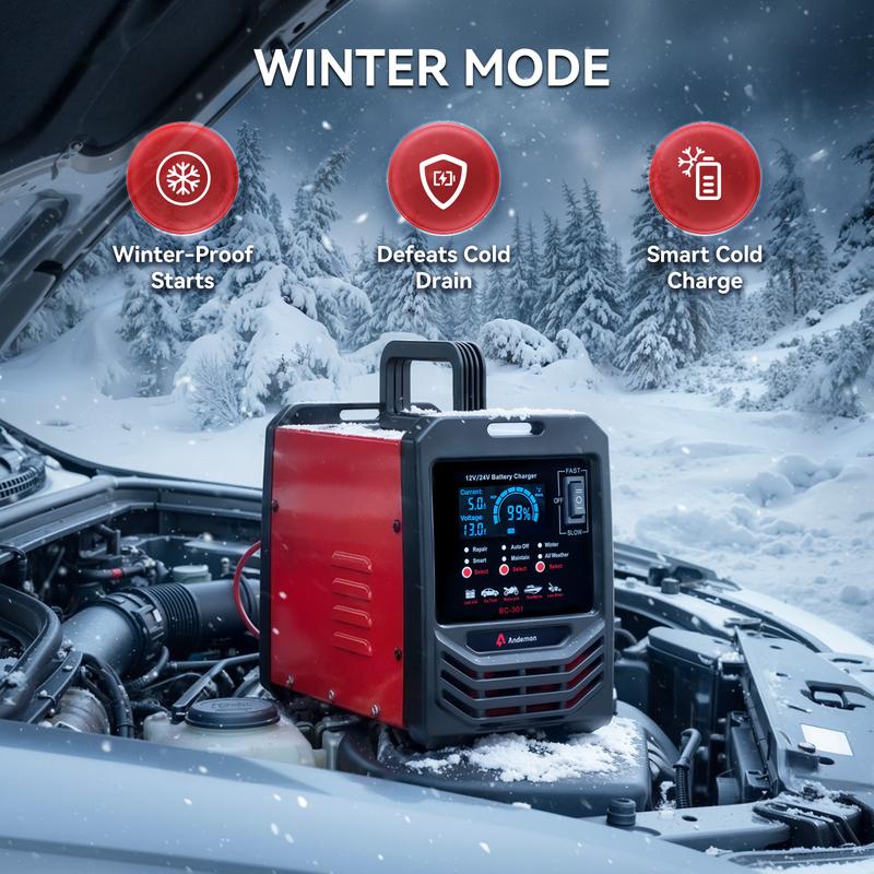 [Winter / All-Season Mode] Designed for all climates, the Winter Mode provides a more complete charge to the battery in cold weather, ensuring a stronger engine start and rescuing winter-drained batteries. All-Season Mode dynamically adjusts and operates intelligently, with multiple protections for safe charging. An easy-to-read LCD digital display shows charging percentage, current, and voltage, providing precise and intuitive charging information.