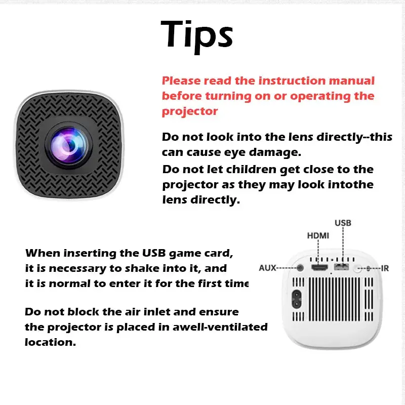 Game controller: The wireless controller is designed to be simple and convenient, plug and play. Simply plug the USB into the projector, and the wireless controller avoids getting close to the screen, effectively protecting the eyes