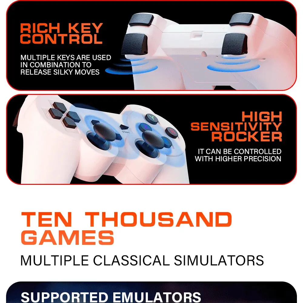 • High definition output: Supports 4K ultra high definition TV video output (1080P/720P) decoding, with a 64GB TF card on the game controller. Use the controller to enter the game page, with a variety of games for you to choose from