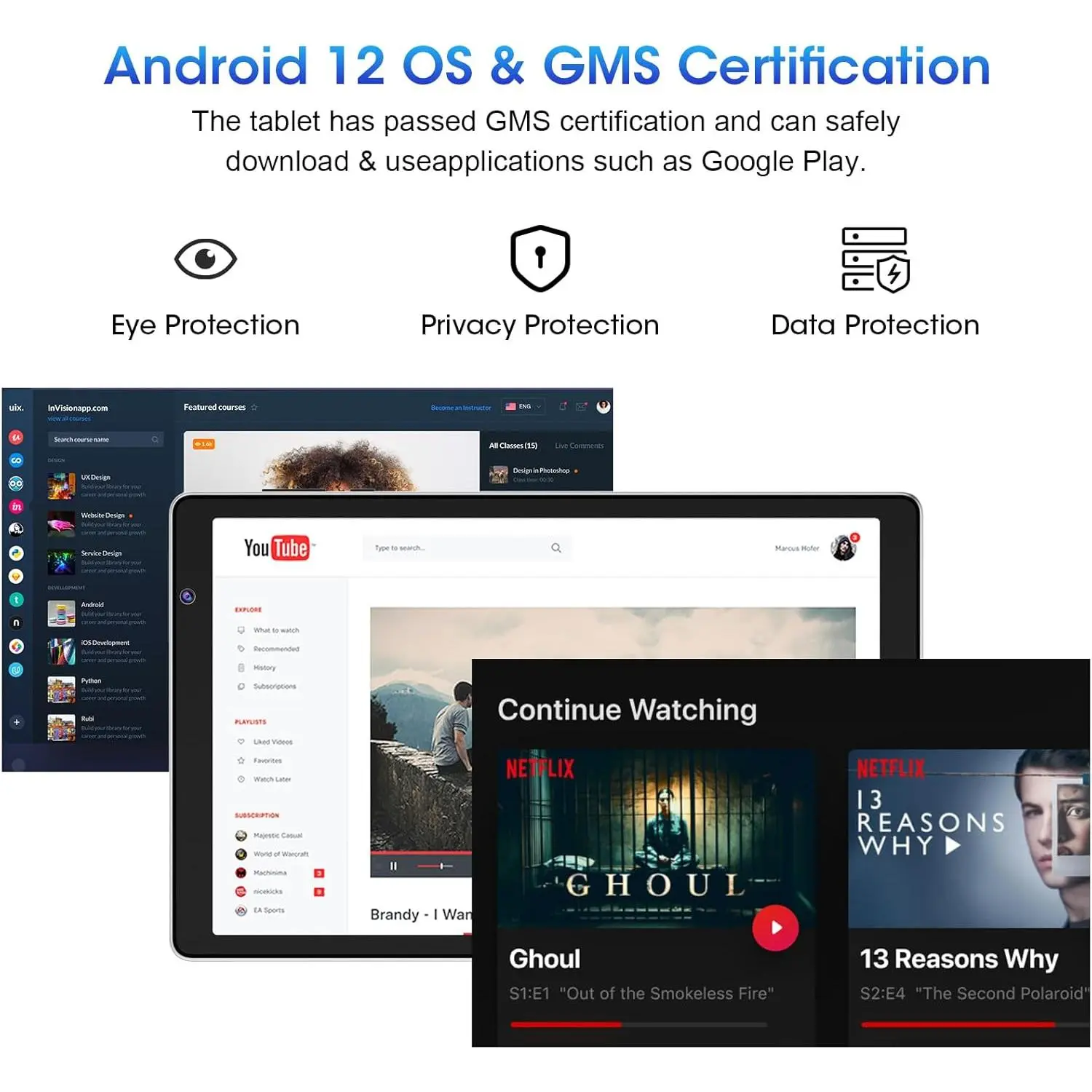 This 10.1-inch Android 12 tablet uses a powerful quad-core processor that delivers smooth and stable performance for daily entertainment, online learning, web browsing, video watching and light office work without any lag.