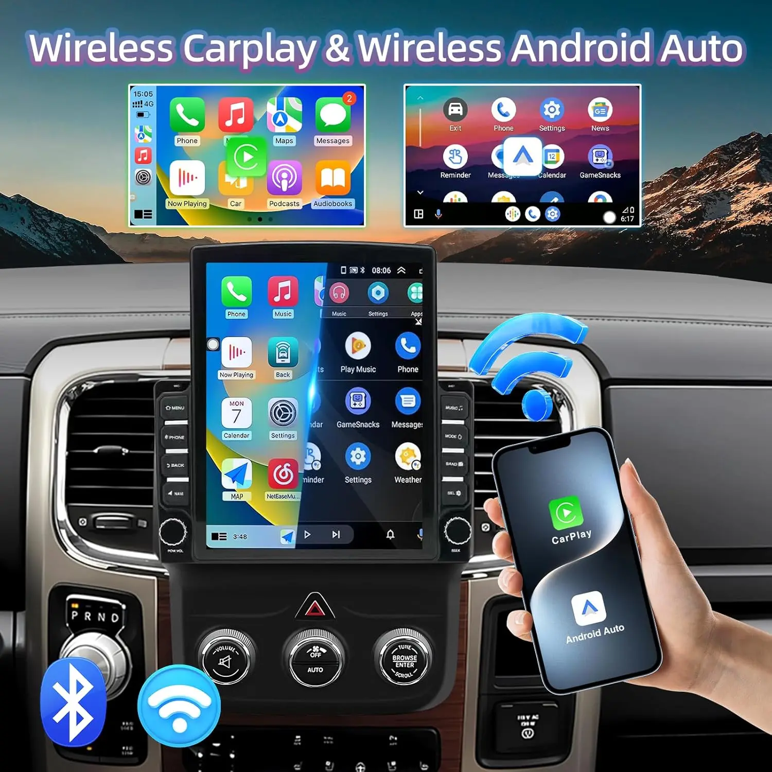 Built-in wireless CarPlay and Android Auto. Enjoy seamless access to music, GPS, calls, and messages through voice commands—keeping your hands free for safe driving. Connect wirelessly via Bluetooth or use a USB cable for instant integration. Stay connected and drive smarter with this user-friendly stereo, perfect compatible with Dodge Ram 1500, 2500, 3500 pickup (2013-2018).