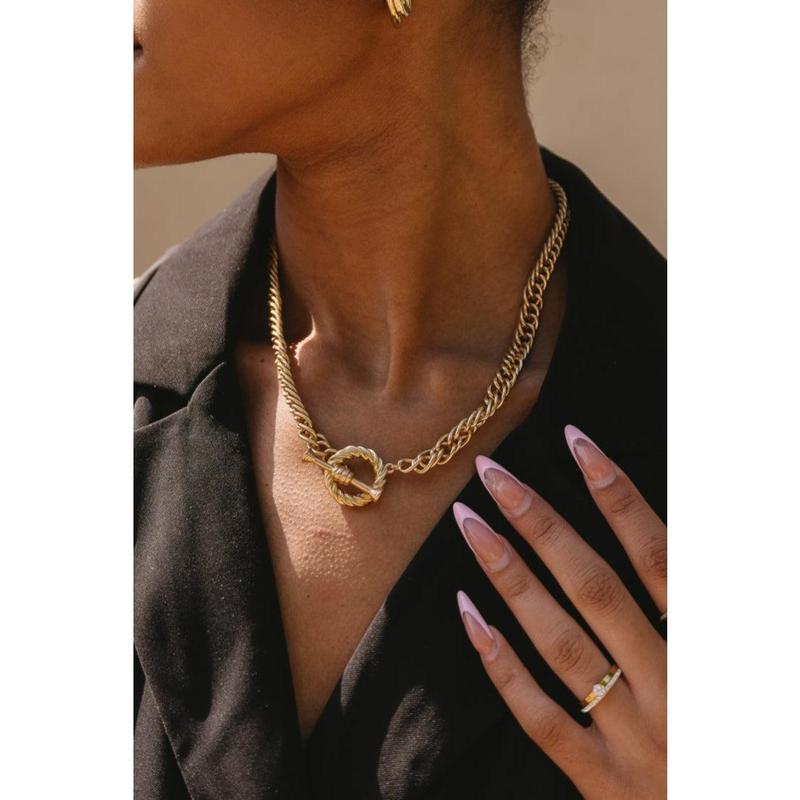 Minimalist elegance meets timeless design in the Angela Gold Roped Open Circle Necklace. Featuring a delicate single-layer gold chain, this piece is accented with a beautifully textured roped open circle for a subtle yet striking detail. The sleek bar closure adds a modern touch, making it easy to wear while enhancing its sophisticated appeal. Perfect for layering or wearing solo, this versatile necklace effortlessly elevates any outfit, from everyday essentials to evening ensembles.