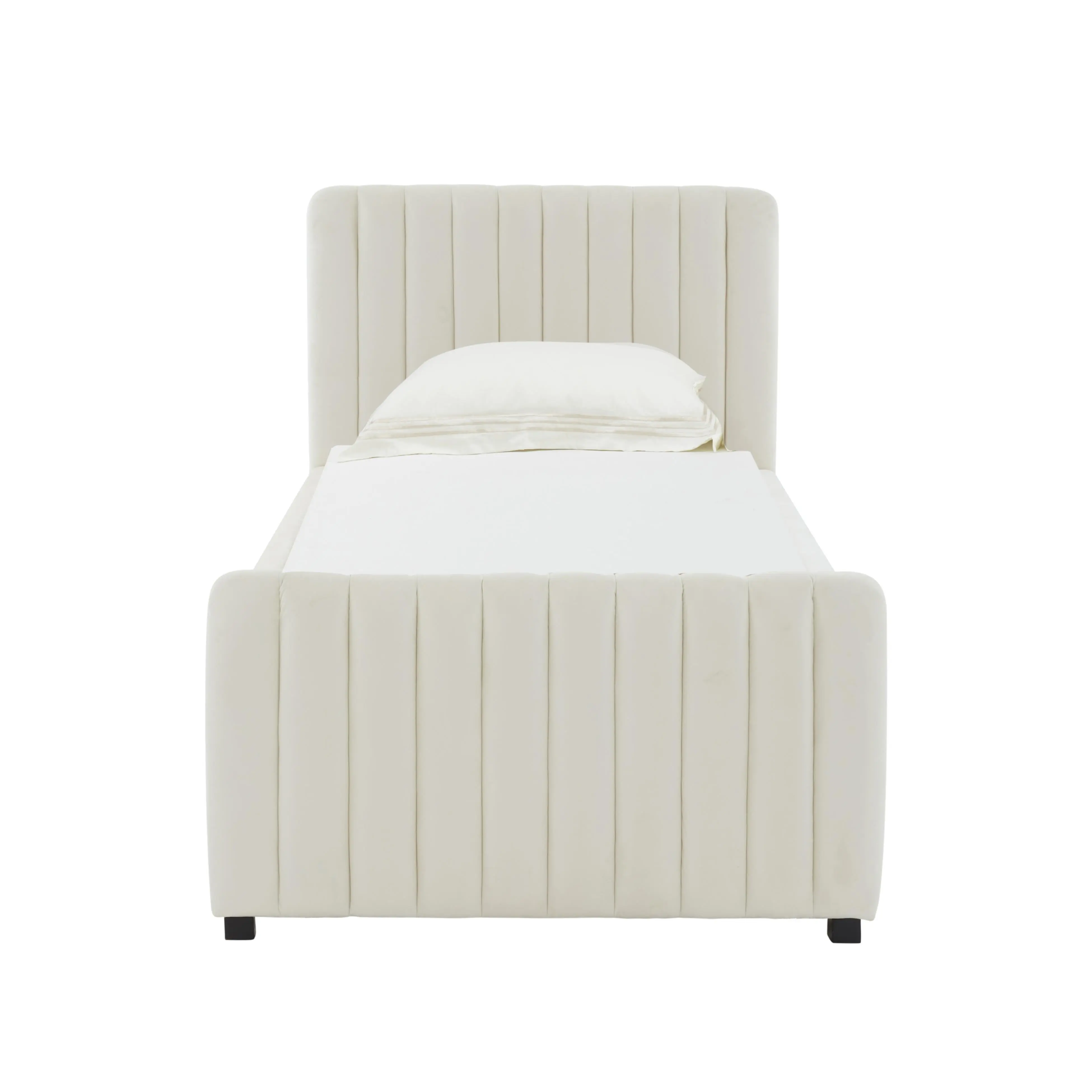 It is compact, cozy, and super functional. The velvet feels rich, and the trundle rolls out smoothly. Ideal for small spaces or guest setups.