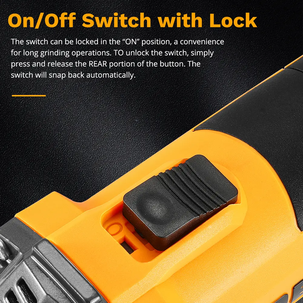 ยทใEASY TO USEใ The angle grinder features a rubberized 2-position side handle that can change from left to right. On/Off Switch with Lock, just tap to lock or snap back. And the wheel guard can change direction as required