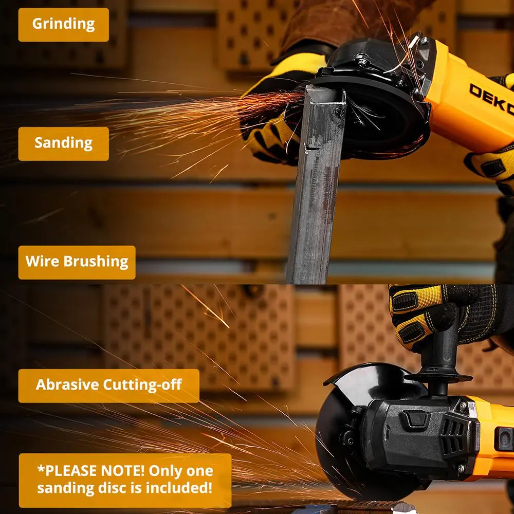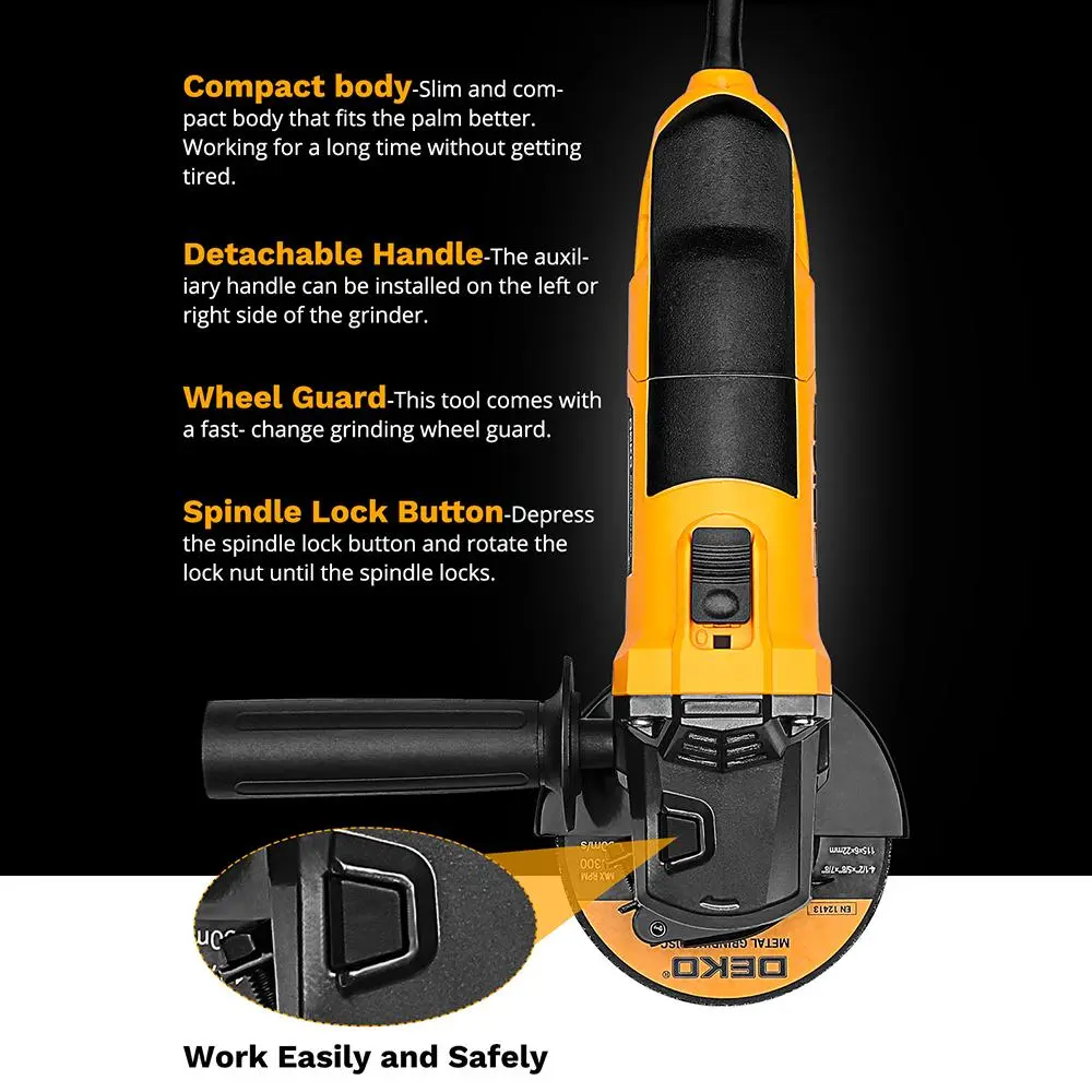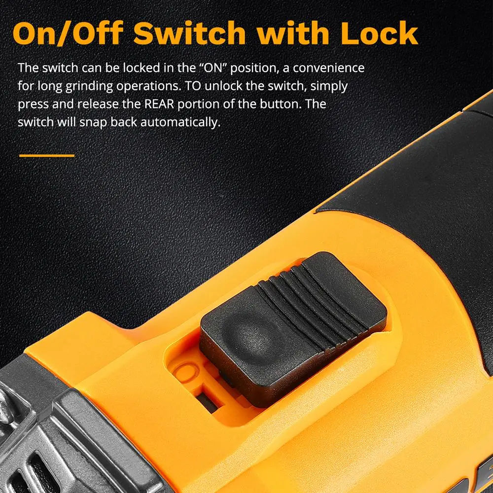 【EASY TO USE】 The angle grinder features a rubberized 2-position side handle that can change from left to right. On/Off Switch with Lock, just tap to lock or snap back. And the wheel guard can change direction as required