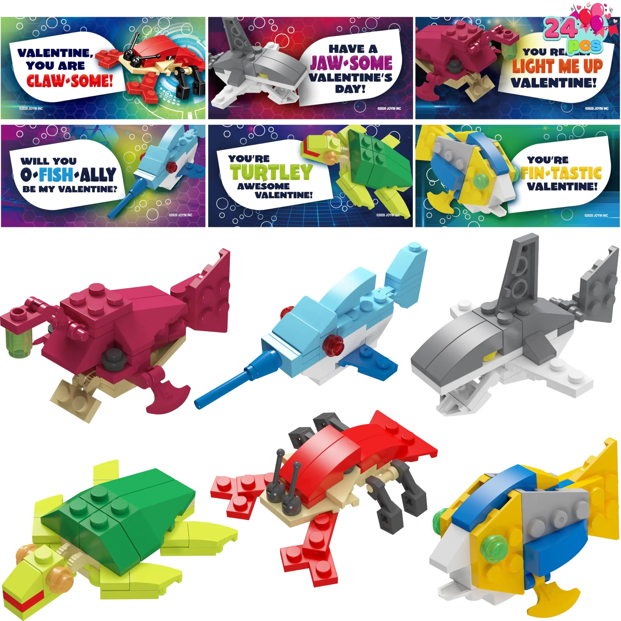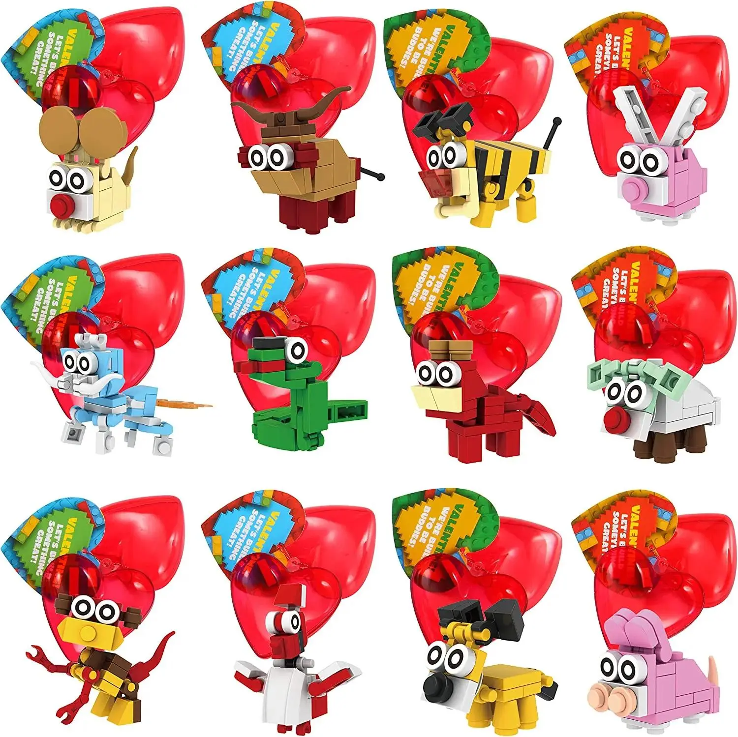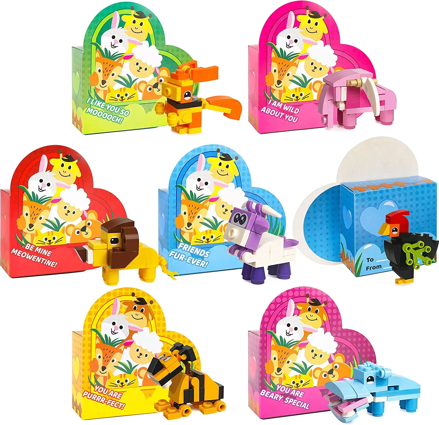 My fault for not putting my glasses on for this purchase. Title says "ANIMAL BUILDING BLOCK VALENTINES". They are NOT building blocks. They are wind-up toys. Misleading. If you're in the market for wind-up toys, these are cute. Just not what I thought I was getting.