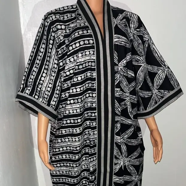 Adire Short Bubu - Stylish Black & White Floral Kimono with Striped Accents for Women
