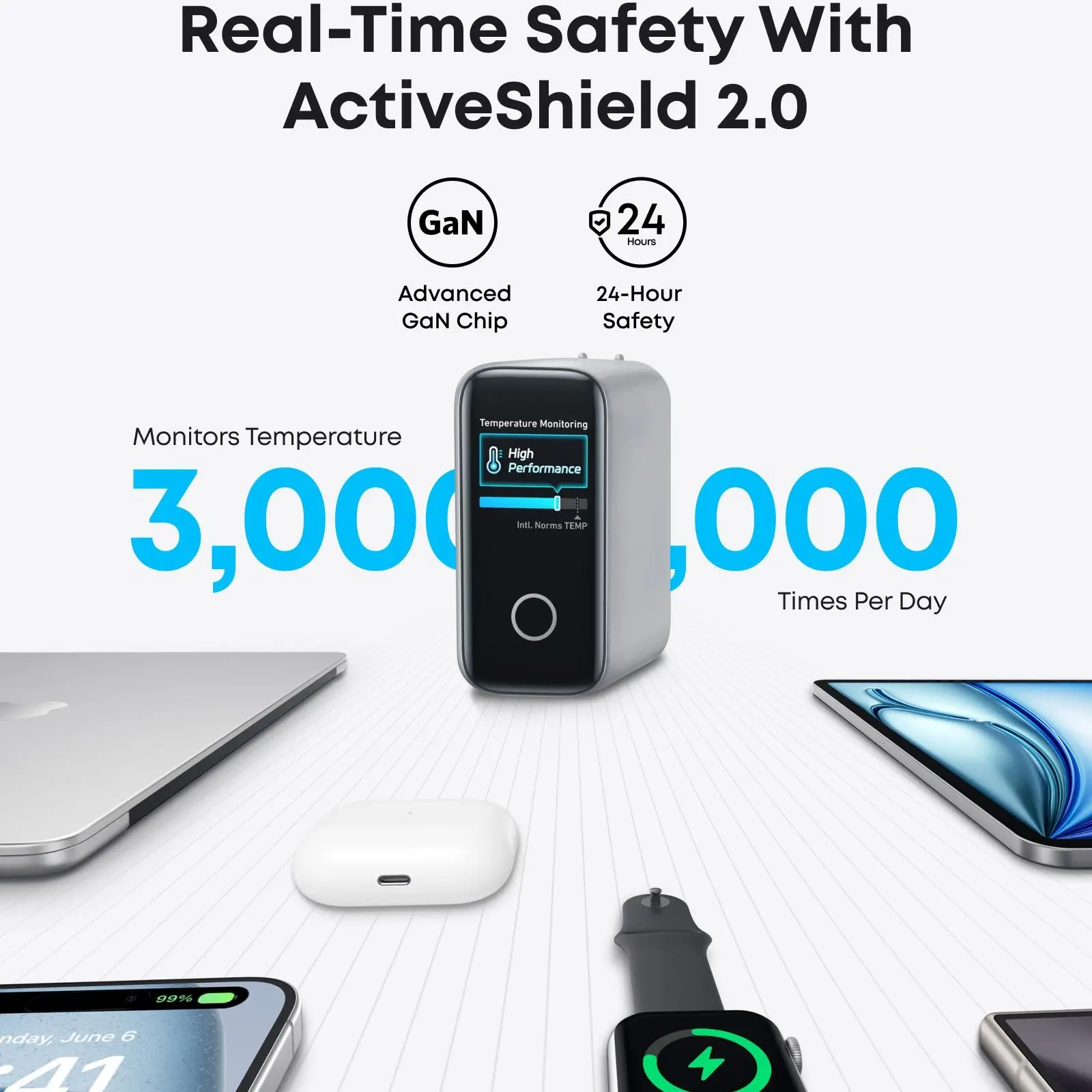 Charges all of my devices at one time. 16" MBP, iphone 16 pro max, Fold 6, and my apple watch. The cables is comes with are nice as well. It will get a bit warm during charging, but it monitors the heat and will auto-protect if needed. 100% recommend.