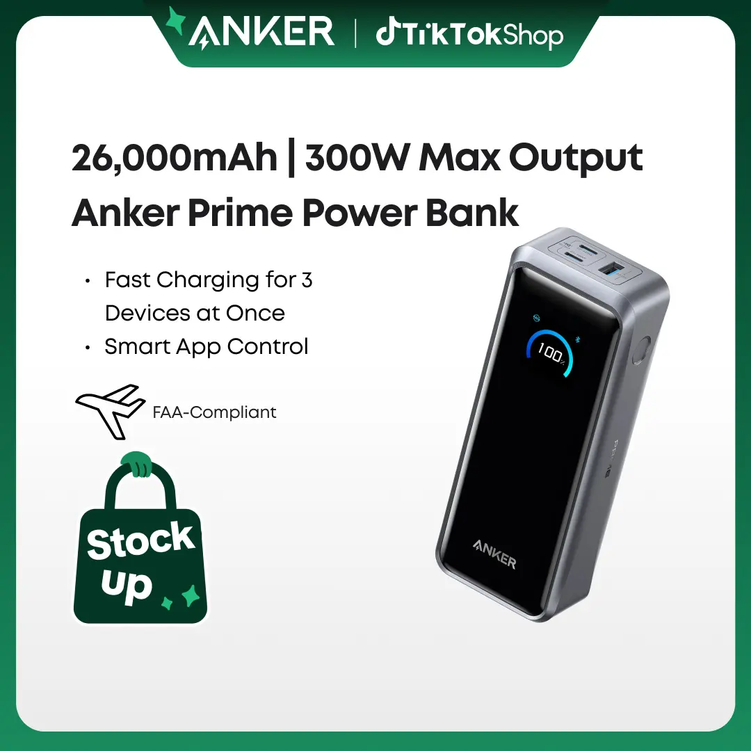 ![[Live Only] Anker Prime Power Bank, 26,250mAh 3-Port Portable Charger with 300W Max Output, Two-Way Charging, TSA-Approved, App Control, for MacBook, iPhone 17/16 Series, and More (Base Not Included) [Live Only] Anker Prime Power Bank, 26,250mAh 3-Port Portable Charger with 300W Max Output, Two-Way Charging, TSA-Approved, App Control, for MacBook, iPhone 17/16 Series, and More (Base Not Included)](https://p16-oec-general-useast8.ttcdn-us.com/tos-useast8-i-rt0ujvrtvp-tx2/d0678597b6ac45abb0b871af6bf440ec~tplv-fhlh96nyum-origin-jpeg.jpeg?dr=12178&t=555f072d&ps=933b5bde&shp=a3510d86&shcp=6ce186a1&idc=useast5&from=2739998086)