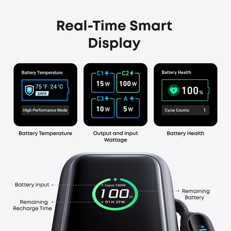 ·25,000mAh for Long-Haul Power: Set off on extended journeys with a huge 25,000mAh capacity that supports your devices through multiple uses, complete with 100W ultra-fast recharging that fuels the power bank to 30% in just 20 minutes.