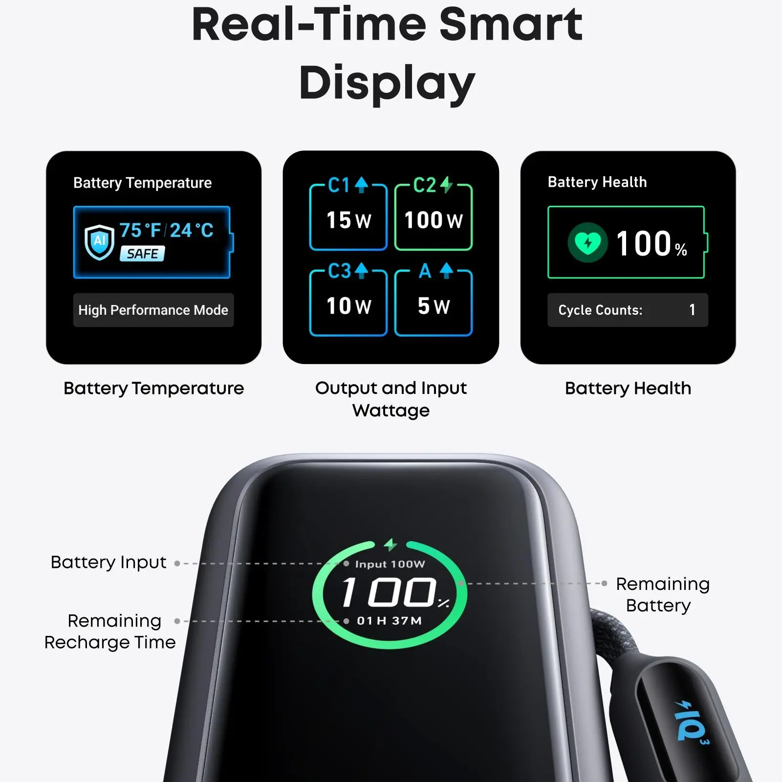 ·25,000mAh for Long-Haul Power: Set off on extended journeys with a huge 25,000mAh capacity that supports your devices through multiple uses, complete with 100W ultra-fast recharging that fuels the power bank to 30% in just 20 minutes.