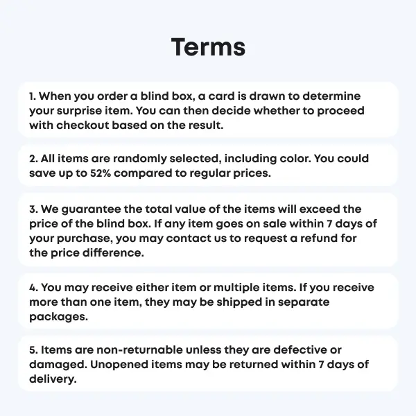 Are you ready for the ultimate unboxing experience? Our exclusive blind box is here to bring you the thrill of surprise! Each box contains ONLY ONE specially curated combination – it's your mystery to unveil. Are you feeling lucky?
