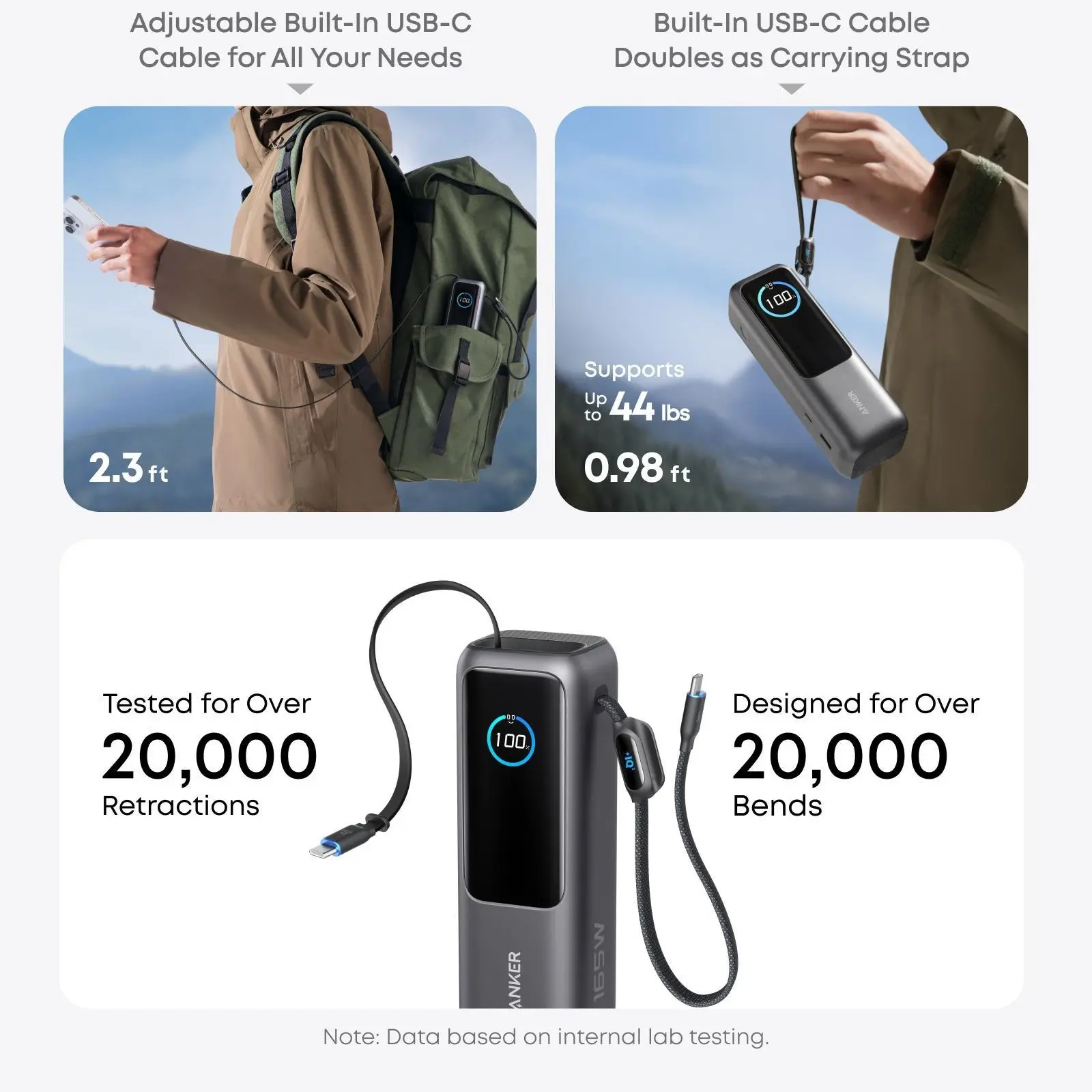 ·Dual Built-In Cables for On-the-Go Use: Equipped with two USB-C cables, one extendable up to 2.3 ft for over 20,000 retractions, and another at 0.98 ft that acts as a durable carrying strap capable of enduring more than 20,000 bends.
