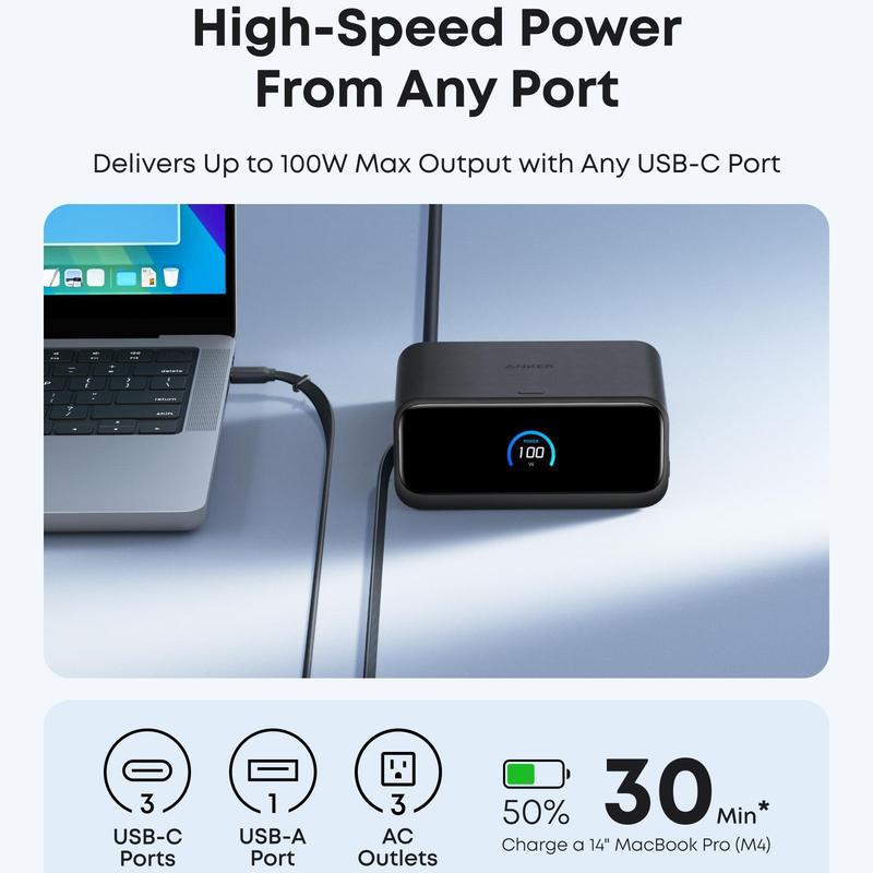 100W Power from Any USB-C Port: Get high-speed charging from any port with 100W USB-C outputs. Power up a 16" MacBook Pro (M3 Pro) to 50% in just 35 minutes and monitor your device's charging status in real-time on the LCD display.