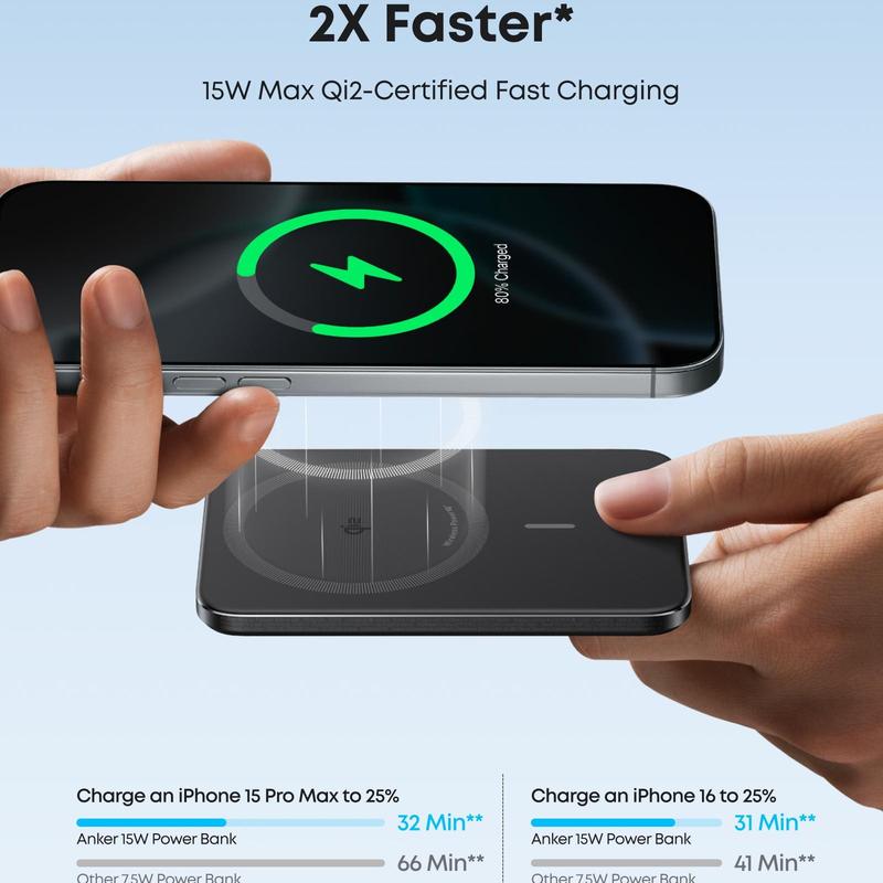 15W MagSafe-Compatible Charging: With 15W Max MagSafe-compatible fast charging, Anker Nano Power Bank provides high efficiency for mobile charging, quickly powering up an iPhone 16 Pro to 25% in just 42 minutes. (Data based on internal lab tests; actual charging performance may vary.)