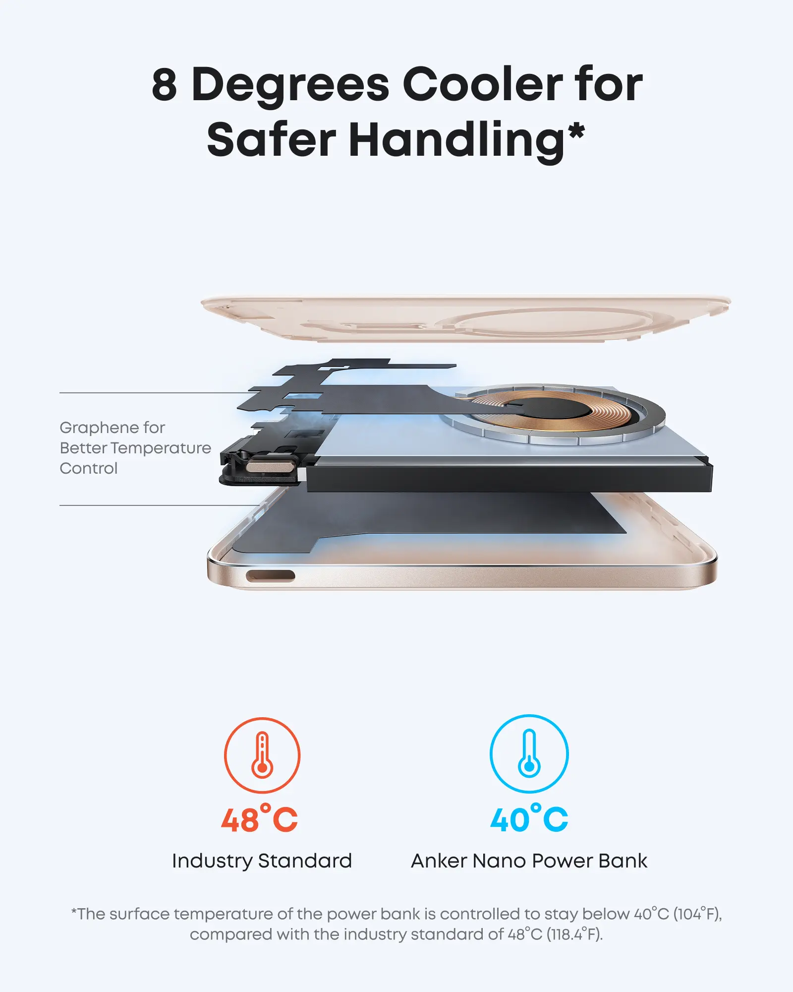 Cool, Consistent Performance: Graphene cooling, dual NTC sensors, and smart temperature control maintain a stable temperature of around 102°F—about 25°F cooler than the industry average—for safer, more reliable fast charging.