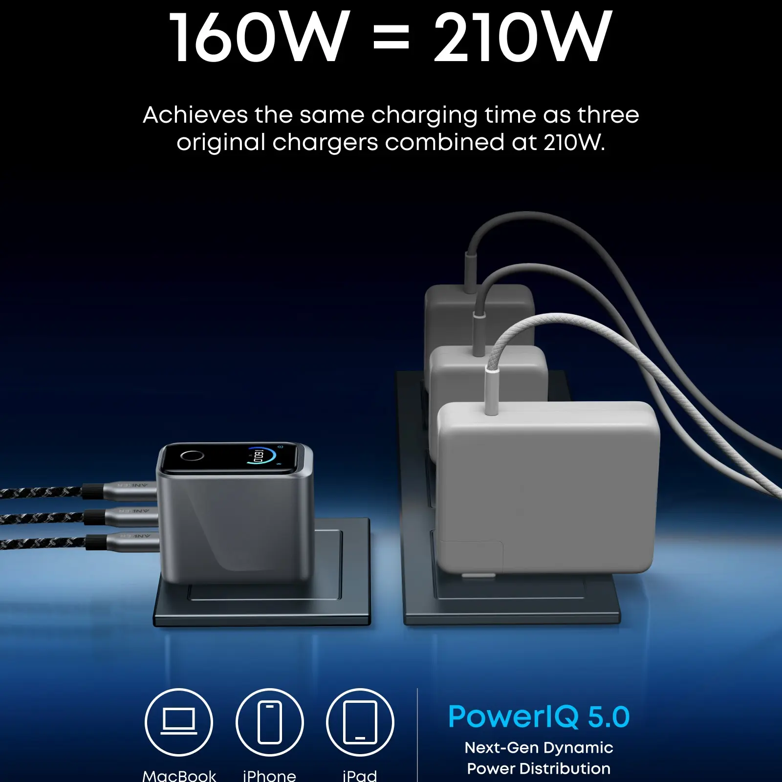 ·Three Devices, One Charger: Power a MacBook Pro, iPhone 16 Pro Max, and iPad Pro at the same time (140W + 35W + 35W) with smart PowerIQ 5.0 power allocation.