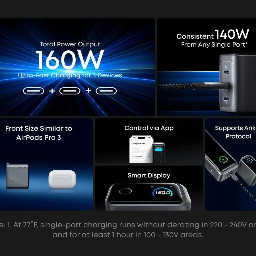 ·Ultra-Compact, Ultra-Powerful: Packed with 160W total output, this compact 3-port GaN charger matches the size of an AirPods Pro 3 case—small enough to carry, powerful enough for all your gear.