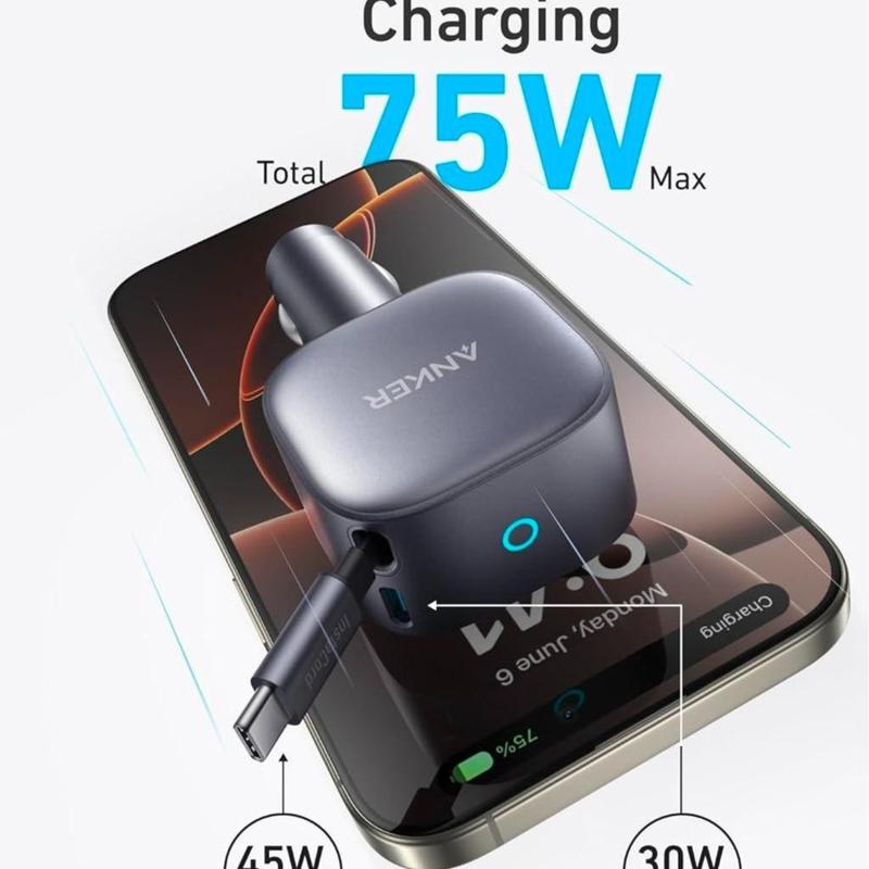This is single-handedly the best car charger for your money! Not only does it have super-fast charging up to 75 watts of power, but it also comes with its own charging cable, so no need to bring your own. It's fast enough to charge your MacBook or laptop in the car! Easy buy!