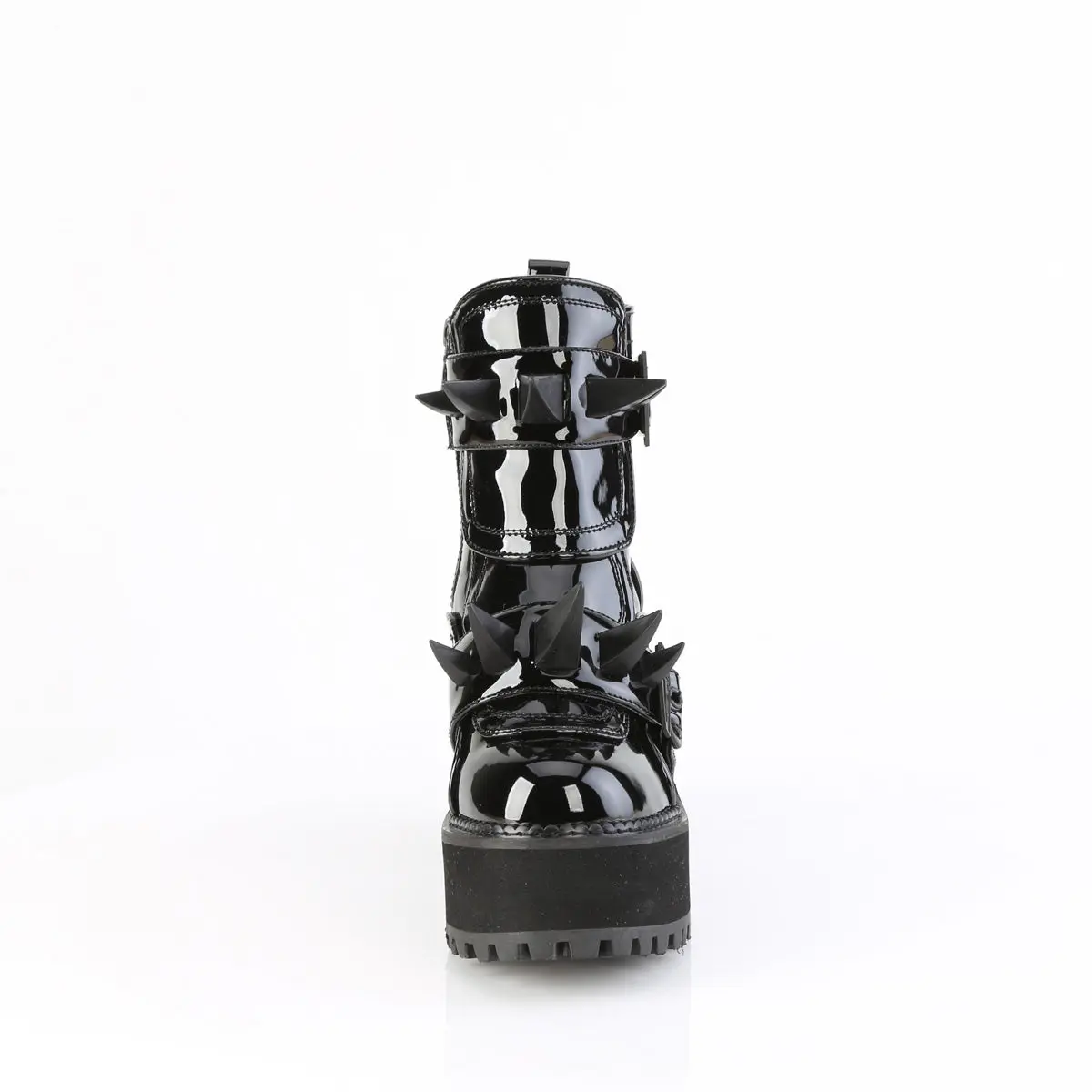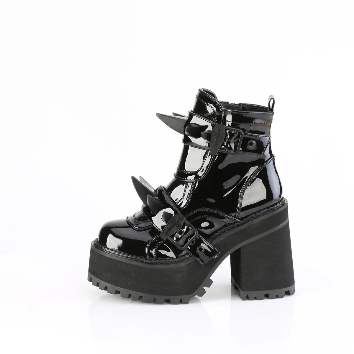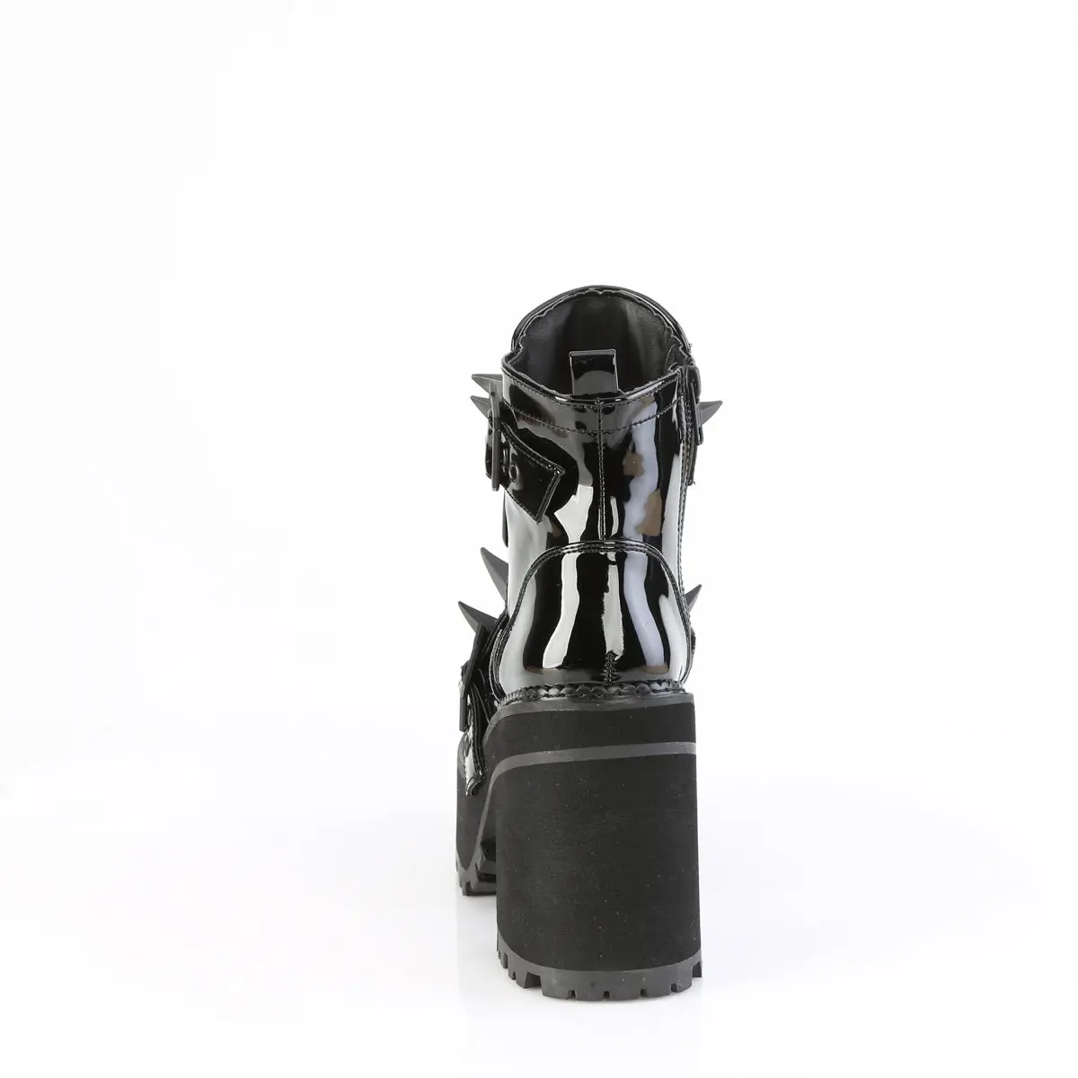 4 3/4" (121mm) Block Heel, 2 1/4" (57mm) Cleated Platform Ankle Boot Feauring Rubber Claw Spike Studded Front Shield w/ Coffin Buckle Straps, Inside Metal Zip Closure