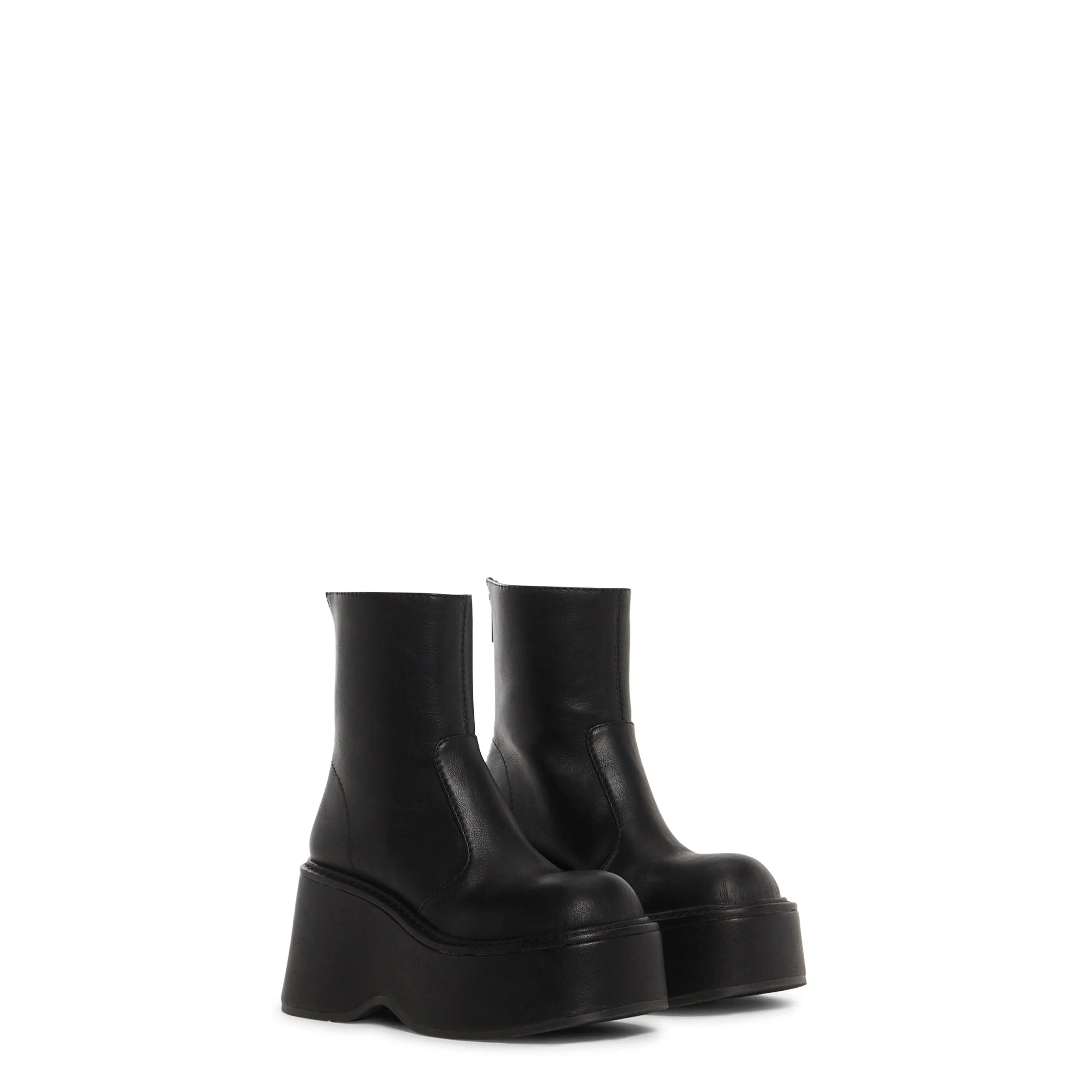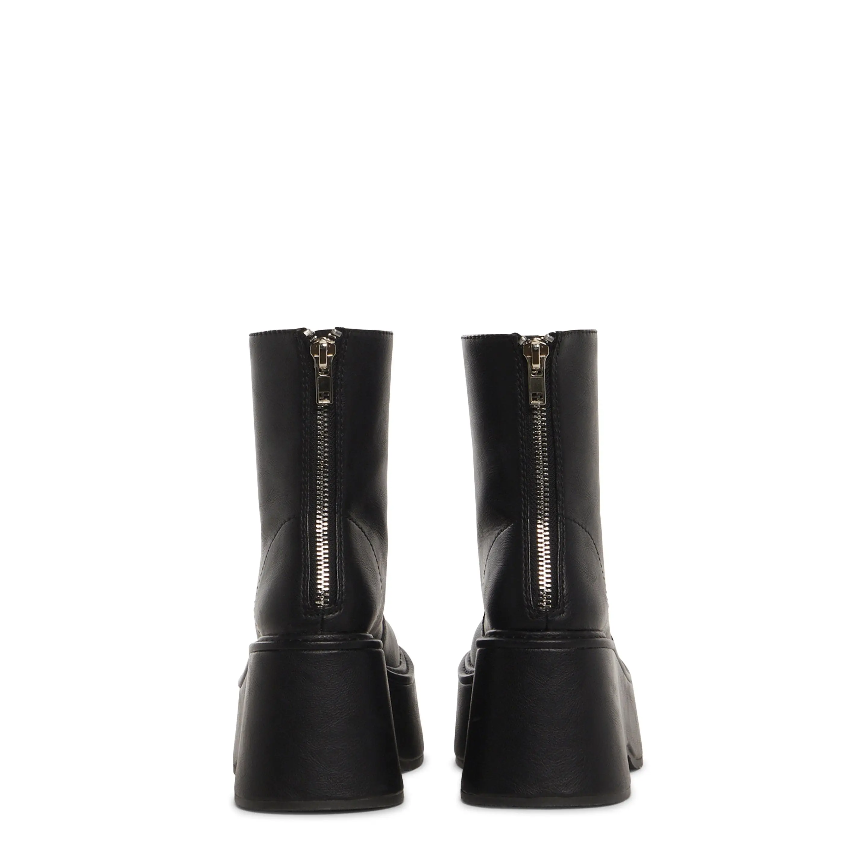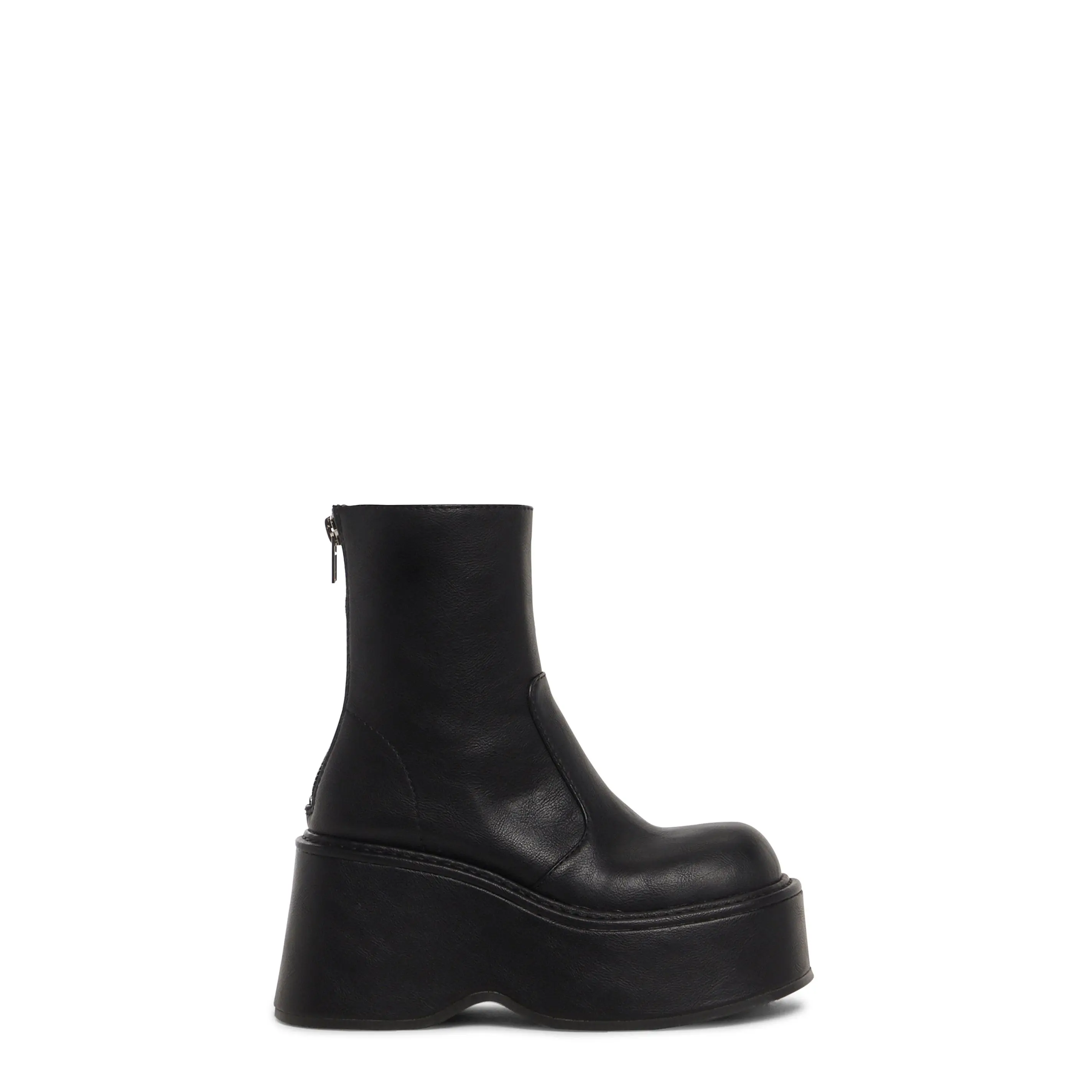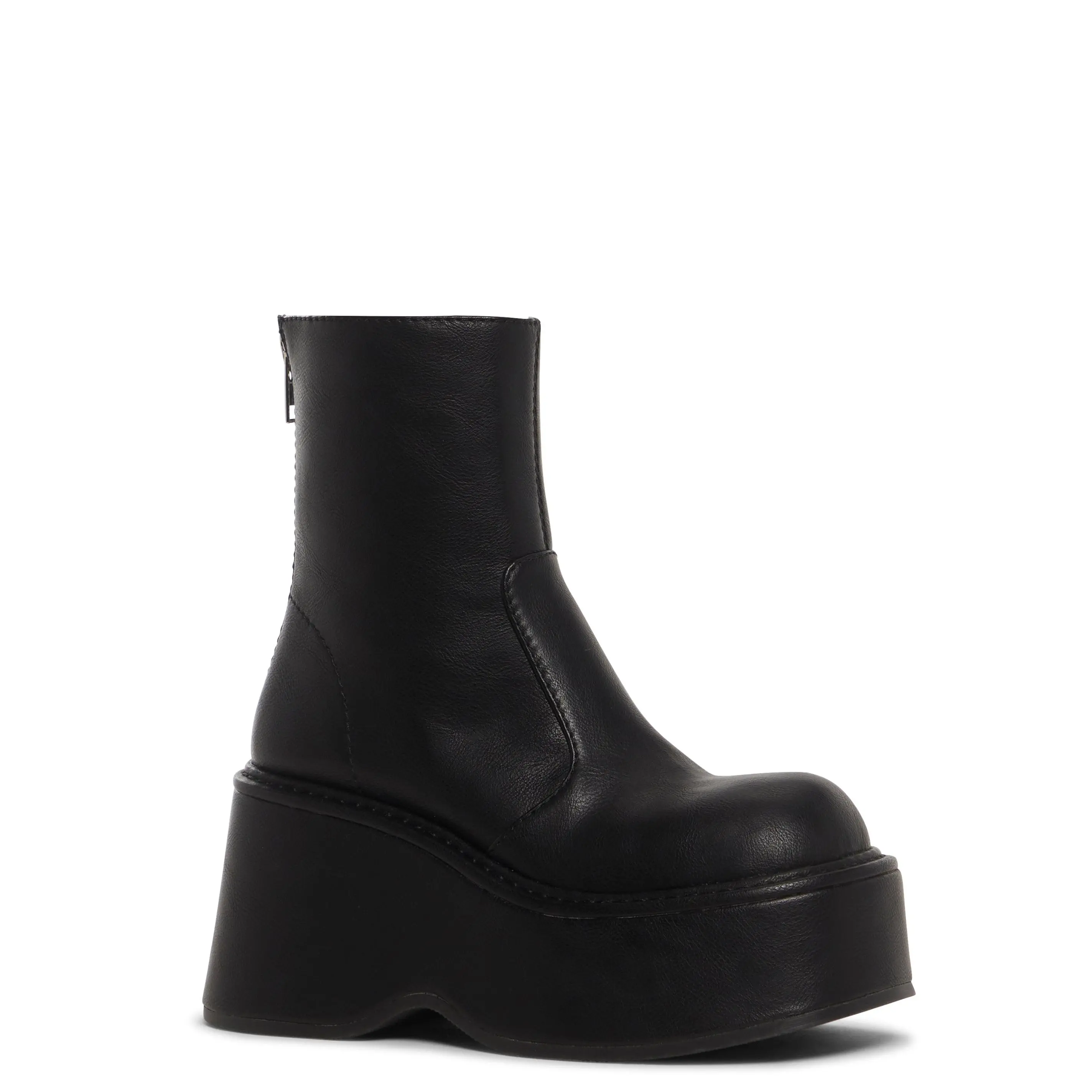 Do whatever you want with these ankle boots that have a vegan leather construction, platform soles, and back zipper closures.