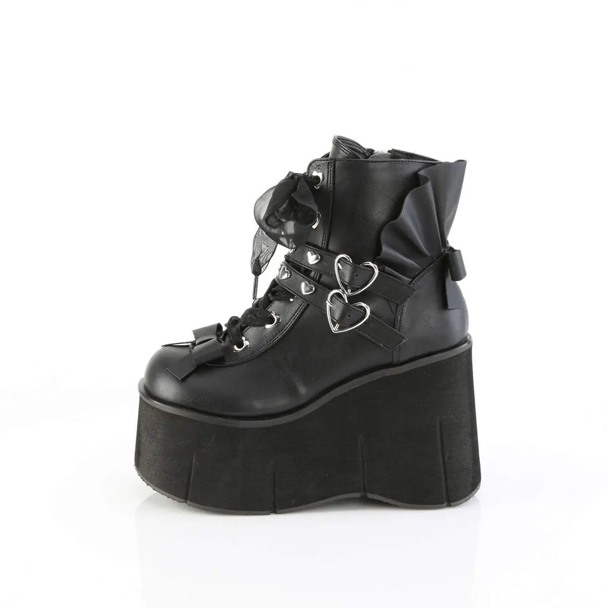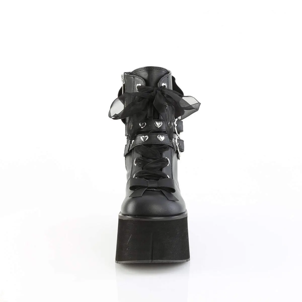 4 1/2" (114mm) Platform Sheer Ribbon Lace-Up Front Heart Eyeletted Ankle Boot Featuring Double Heart Studded Straps w/ Heart Buckles and Ruffle & Bow Details, Inner Side Metal Zip Closure