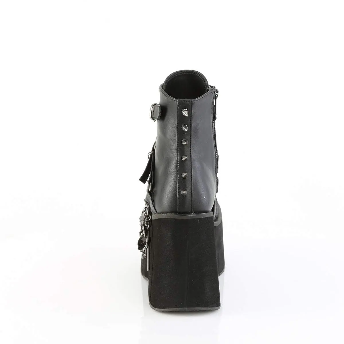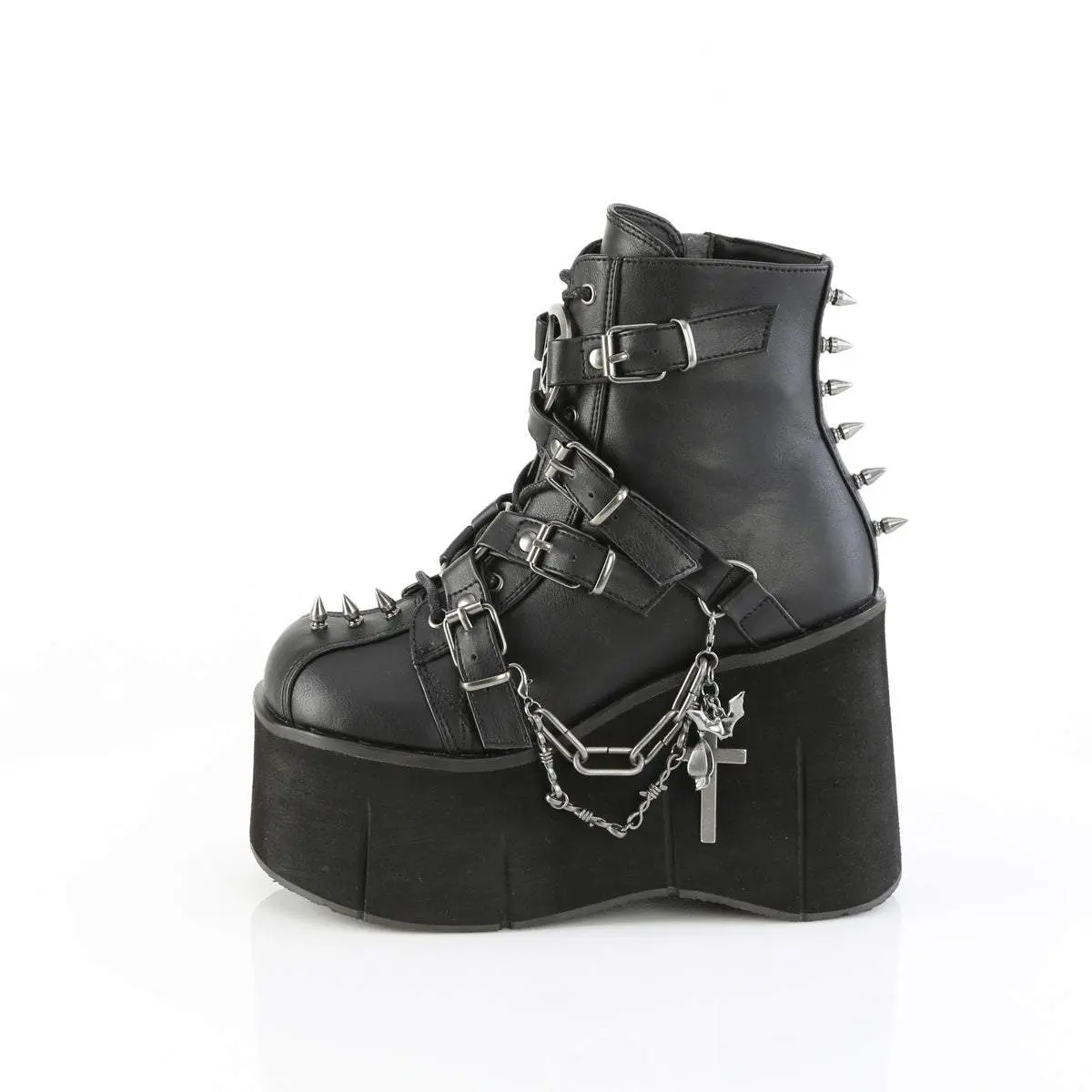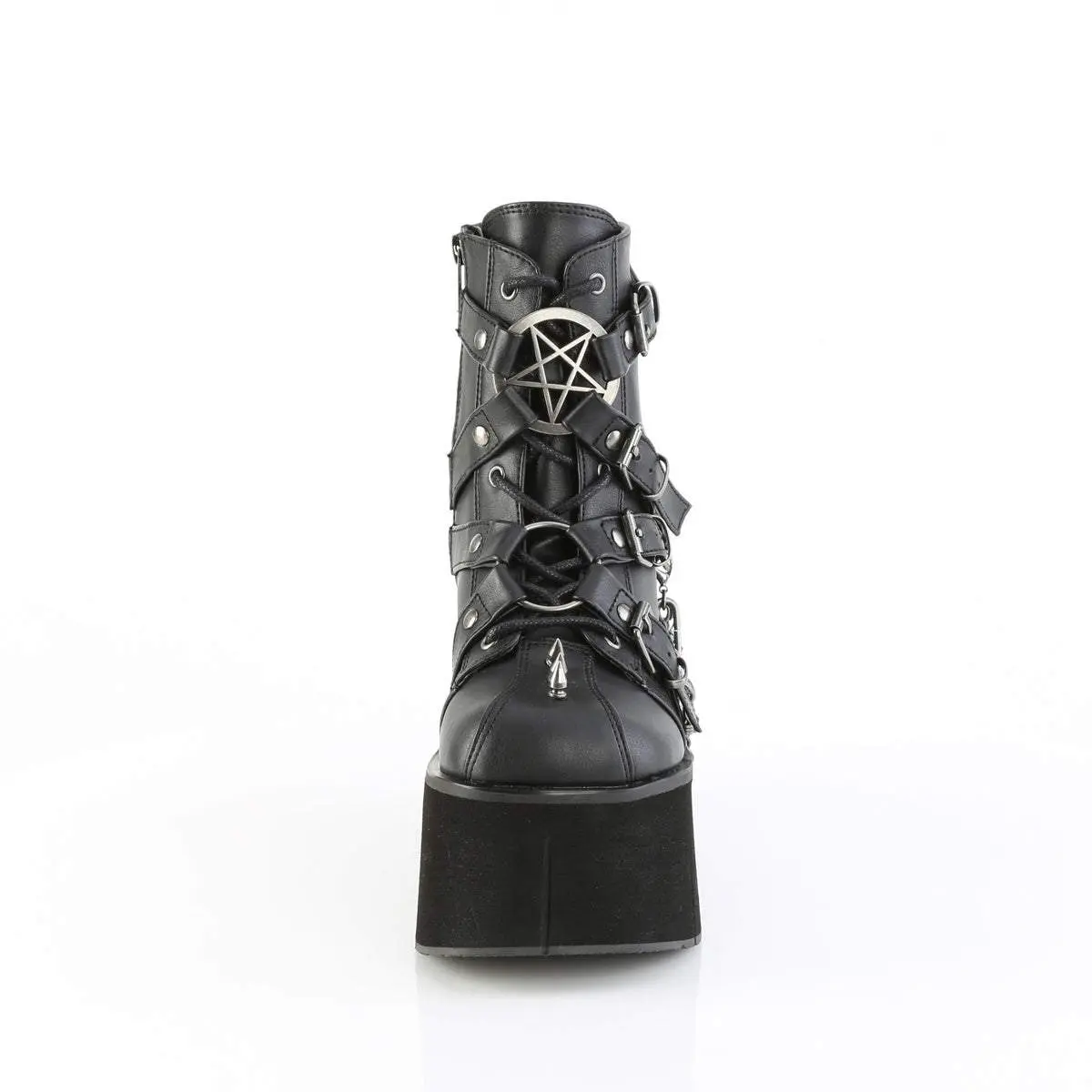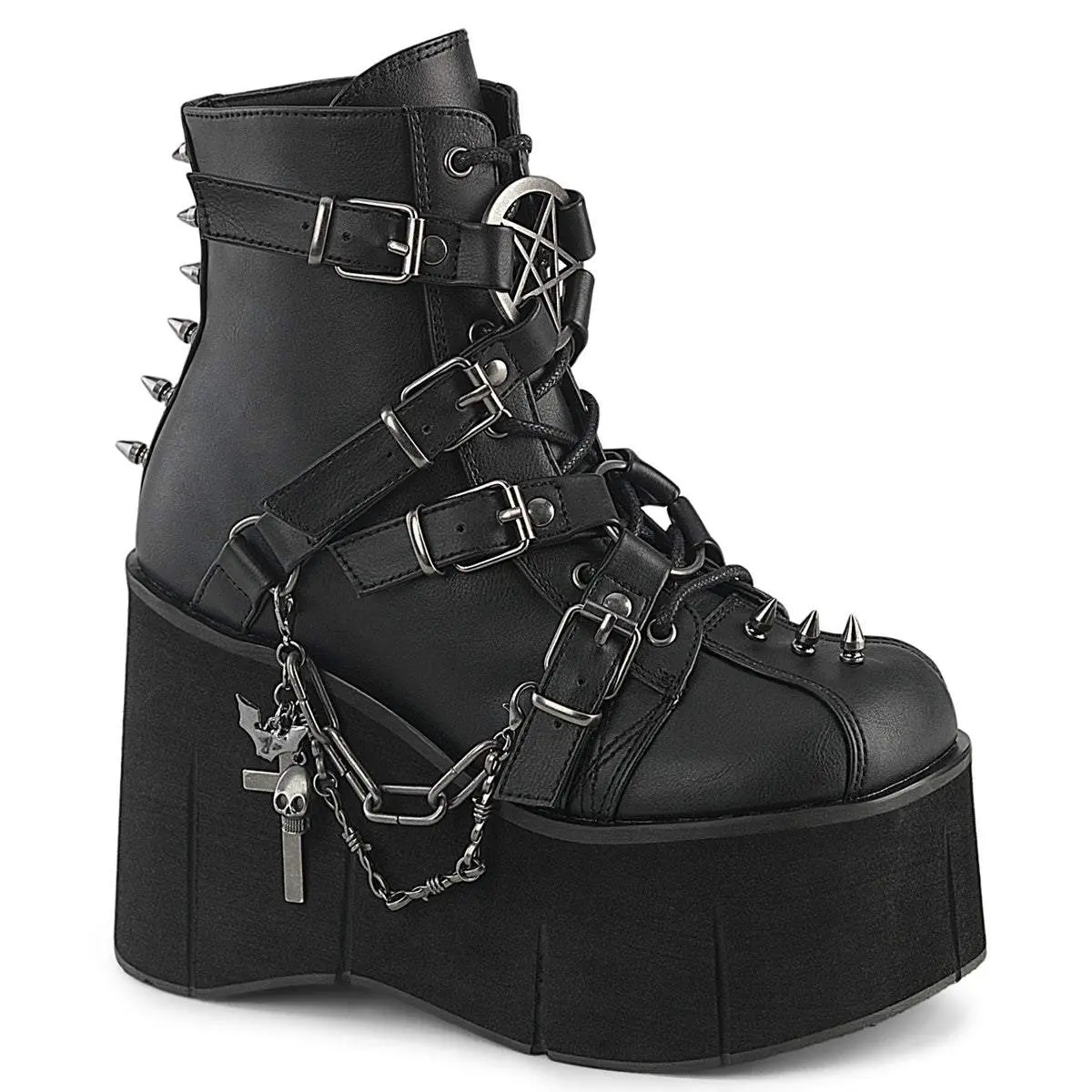 The Demonia Kera-68 Black Vegan Leather Ankle Boots feature a striking 4 1/2" (114mm) platform. This lace-up front boot includes a front harness strap with pentagram and O-ring centers. Metal spike studs add a bold touch. A hanging double chain and charm complete the design. Ideal for those who love unique footwear.