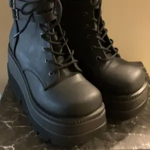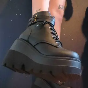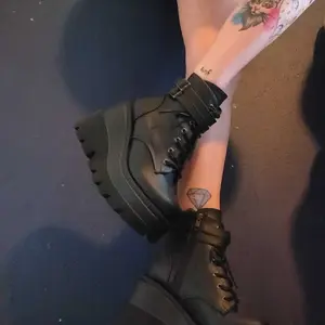 This Demonia ankle boot features a daring 4.5" stacked wedge platform, transforming any outfit. The striking black vegan leather adds an edgy touch. Lace-up front and double buckled ankle straps ensure a secure fit. The full inner side zip closure offers ease of wear. Perfect for clubs or special occasions, Shaker-52 makes a bold statement.