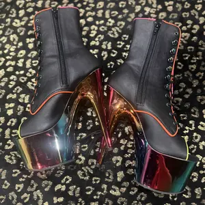 Introduce some serious flair to your wardrobe with the Adore-1021RC-02 ankle boots. Boasting a towering 7" heel and a 2 3/4" platform, these boots combine a daring peep-toe with a vibrant rainbow chrome-plated base. Made from black vegan leather, they feature blacklight reactive piping that pops under UV light for an electrifying effect. The lace-up front adds an edgy detail, complemented by an inside zip closure. Perfect for anyone looking to make a colorful and bold addition to their ensemble.