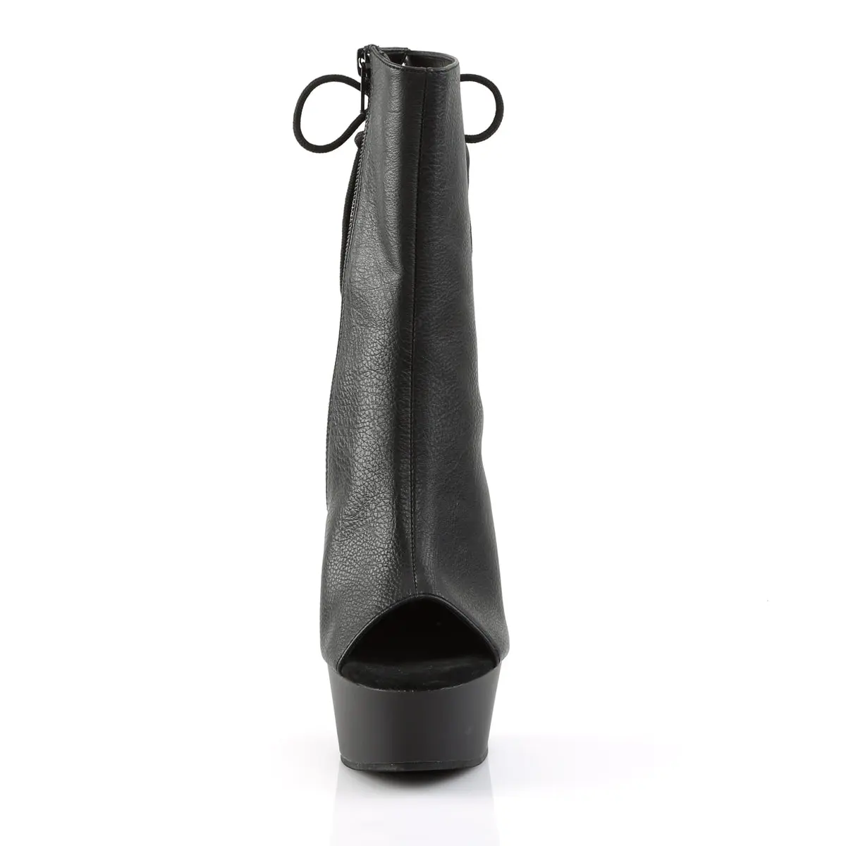 Unleash your inner diva with the Delight-1018 Ankle Boot in black vegan leather. Featuring a bold 6" heel and a 1 3/4" platform, these boots offer a striking design with an open toe and heel. The lace-up back adds an edgy touch, while the inside zip closure ensures easy wear. Plus, a hidden zip pocket provides a discreet place for your essentials, blending functionality with fierce style.