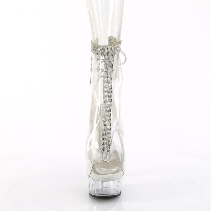 Unleash your inner diva with the Delight-1018C-2RS ankle boots. These standout boots boast a 6-inch heel paired with a 1 3/4-inch platform, putting you head and shoulders above the rest. The open toe and heel design is accentuated by glistening rhinestones along the center front and topline, creating a captivating look. The lace-up back adds an element of intrigue, while the inner side zip closure adds practicality. Crafted in a clear material, these boots offer a bold and modern fashion statement that's perfect for any daring outfit.
