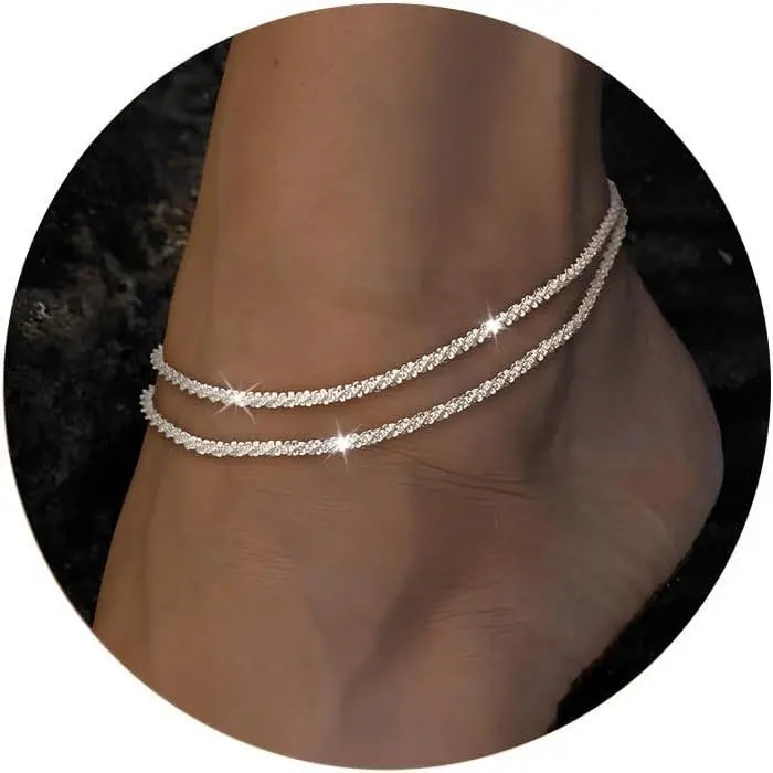 Layered silver ankle bracelets for women