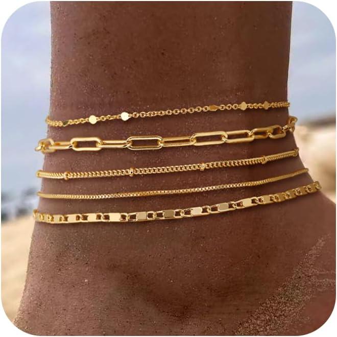 5. TEWIKY Waterproof Ankle Bracelets For Women 6PCS Thiny Herringbone Box Paperclip Bead Figaro Cuban Link Anklet Set Dainty Jewelry For Women Cute Summer Beach Jewelry Chains Beaded anklet