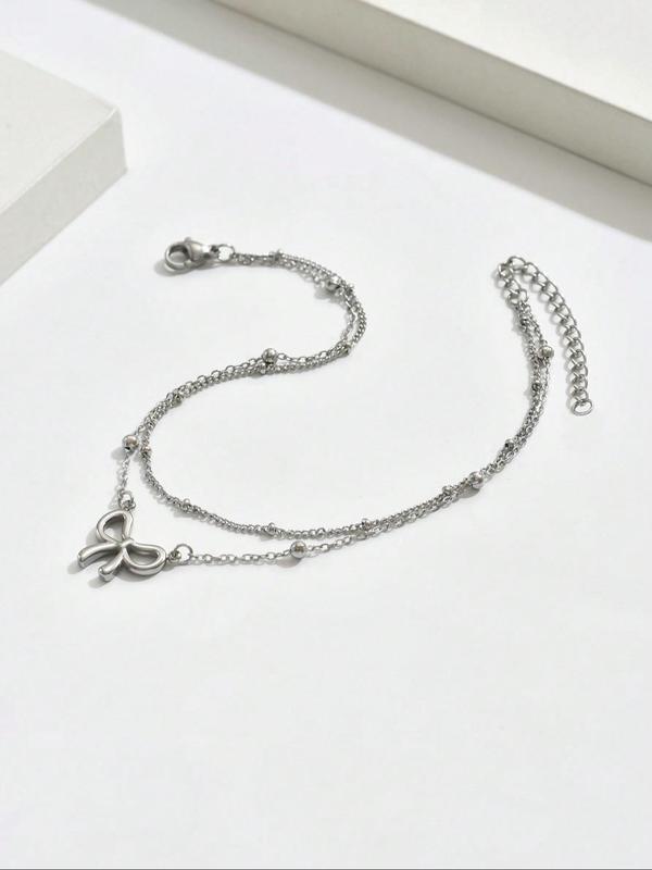 Fashion Double Layer Bow Design Anklet, Boho Anklet, Stainless Steel Foot Jewelry for Women & Girls, Elegant All-match for Daily Wear