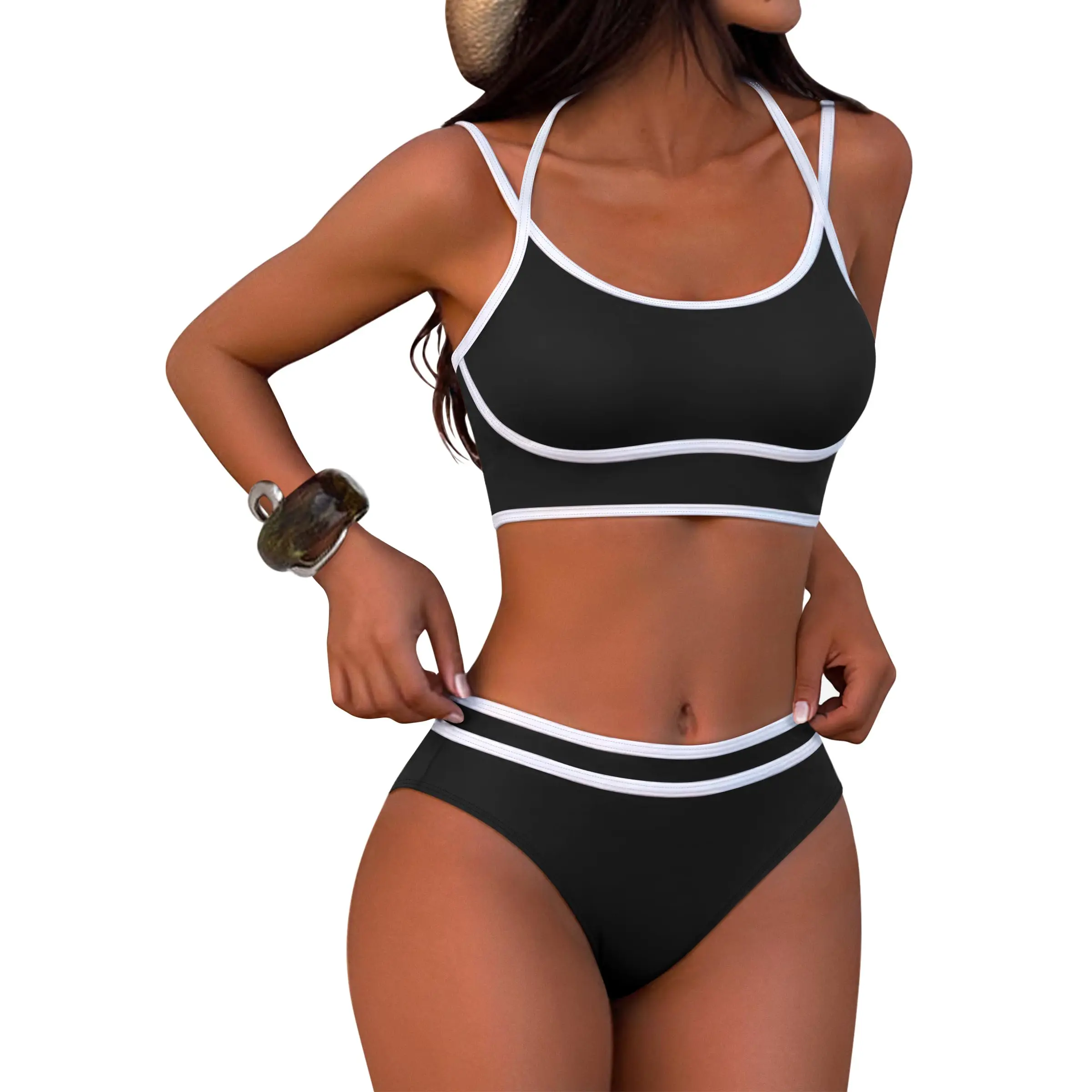 ·Features - The 2 piece swimsuit for womens is designed with sporty scoop neck crop top, adjustable straps and halter neck ties, high waist bikini bottom, high cut, color block. This bathing suit for women has enough coverage and support. And this athletic color block swimsuit is designed with contrast bright color which offers charming femininity.